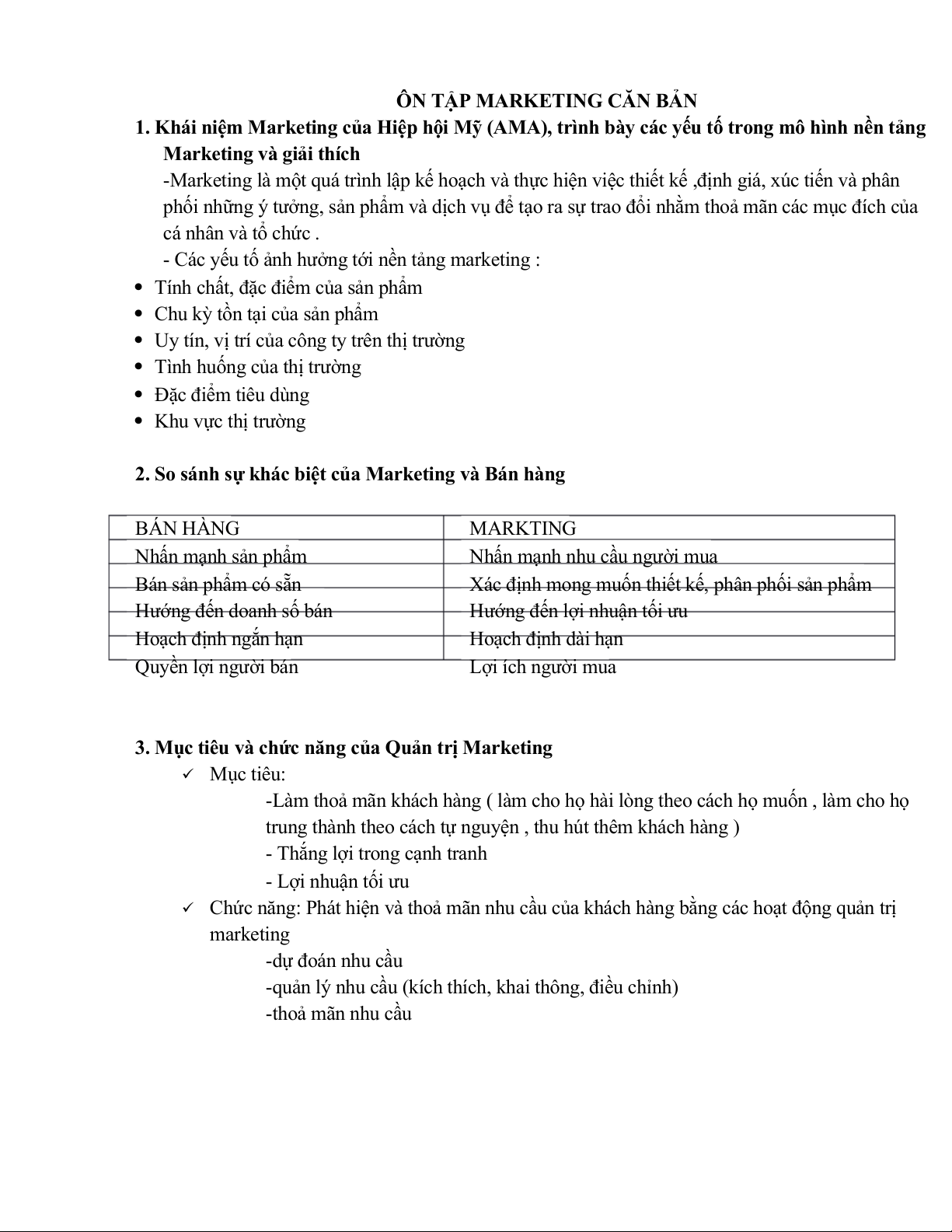 1. Khái niệm Marketing của Hiệp hội Mỹ (AMA), trình bày các yếu tố trong mô hình nền tảng Marketing và giải thích