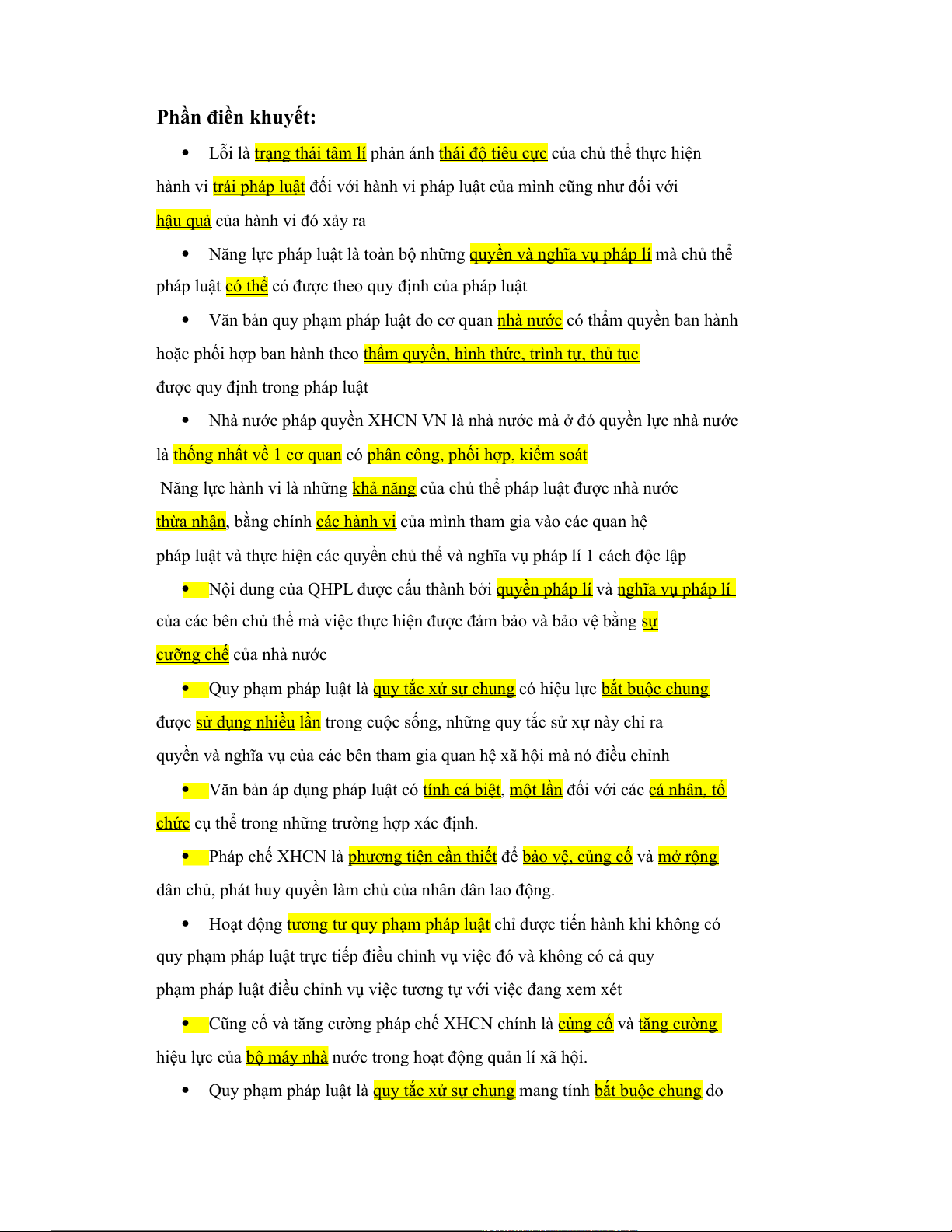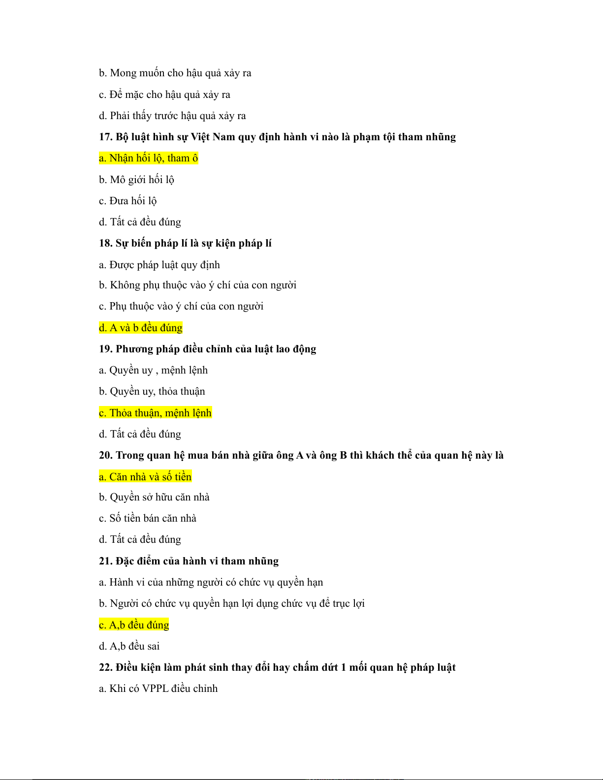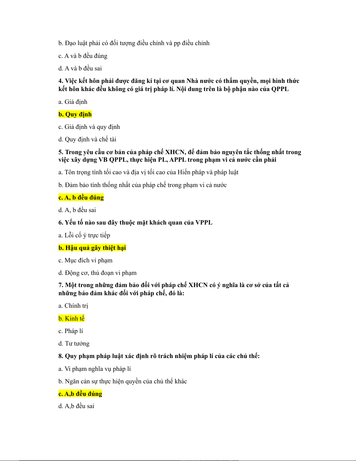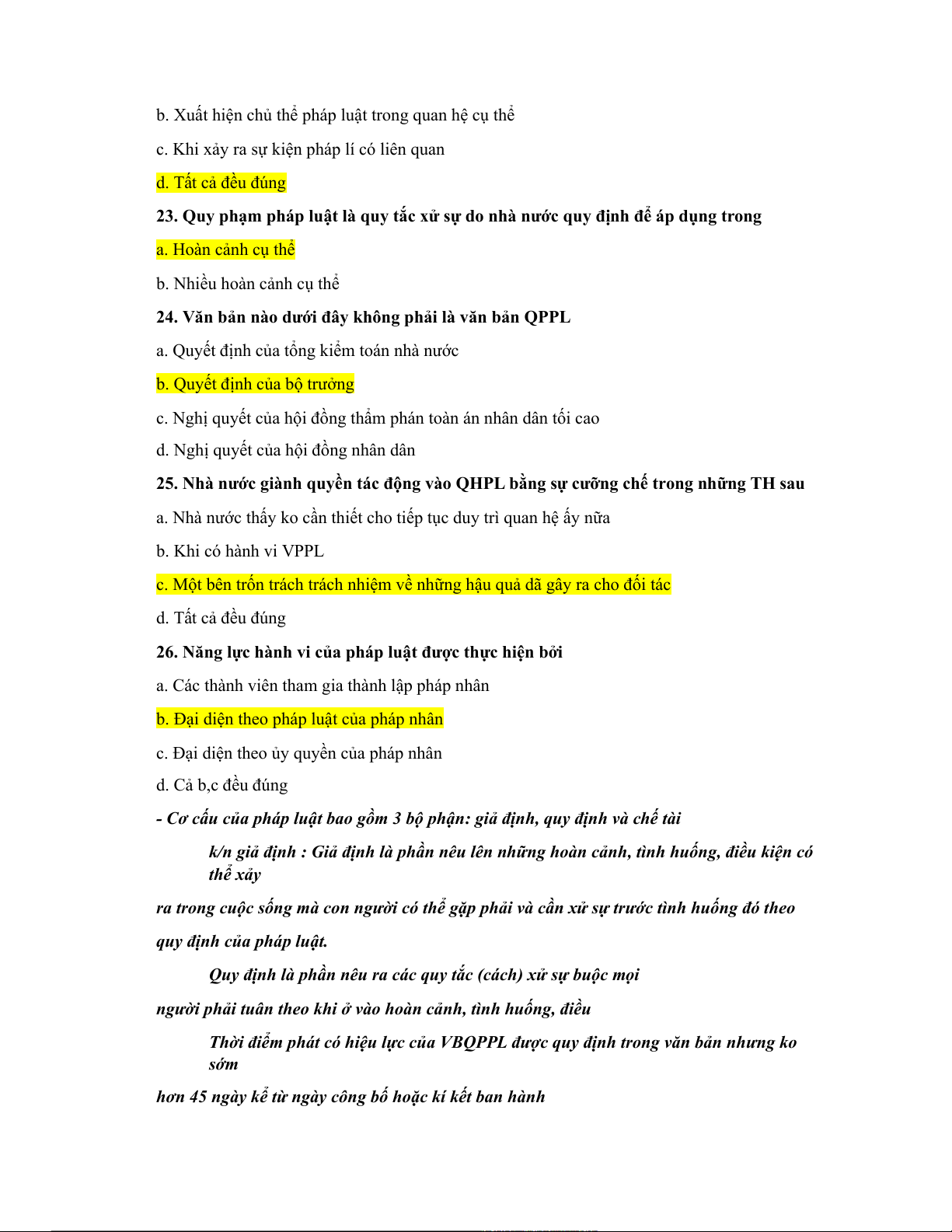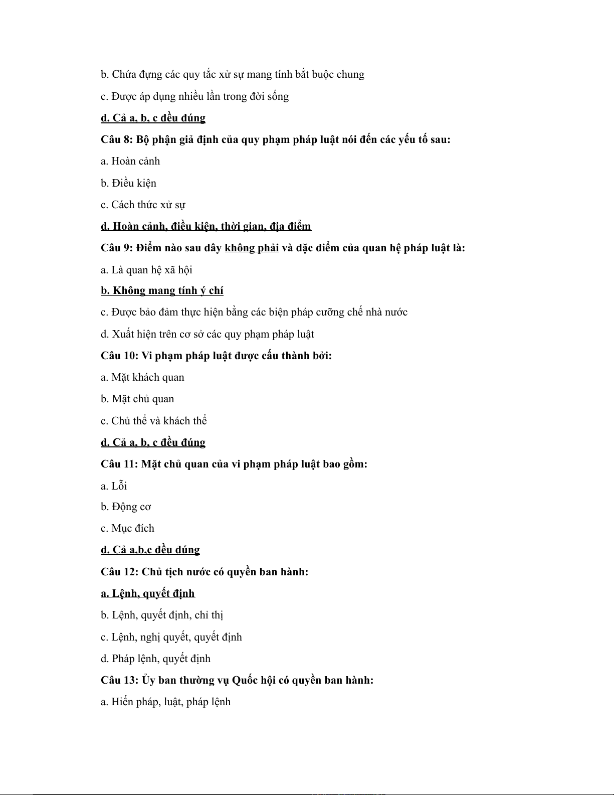 Câu 8: Bộ phận giả định của quy phạm pháp luật nói đến các yếu tố sau: a. Hoàn cảnh b. Điều kiện c. Cách thức xử sự