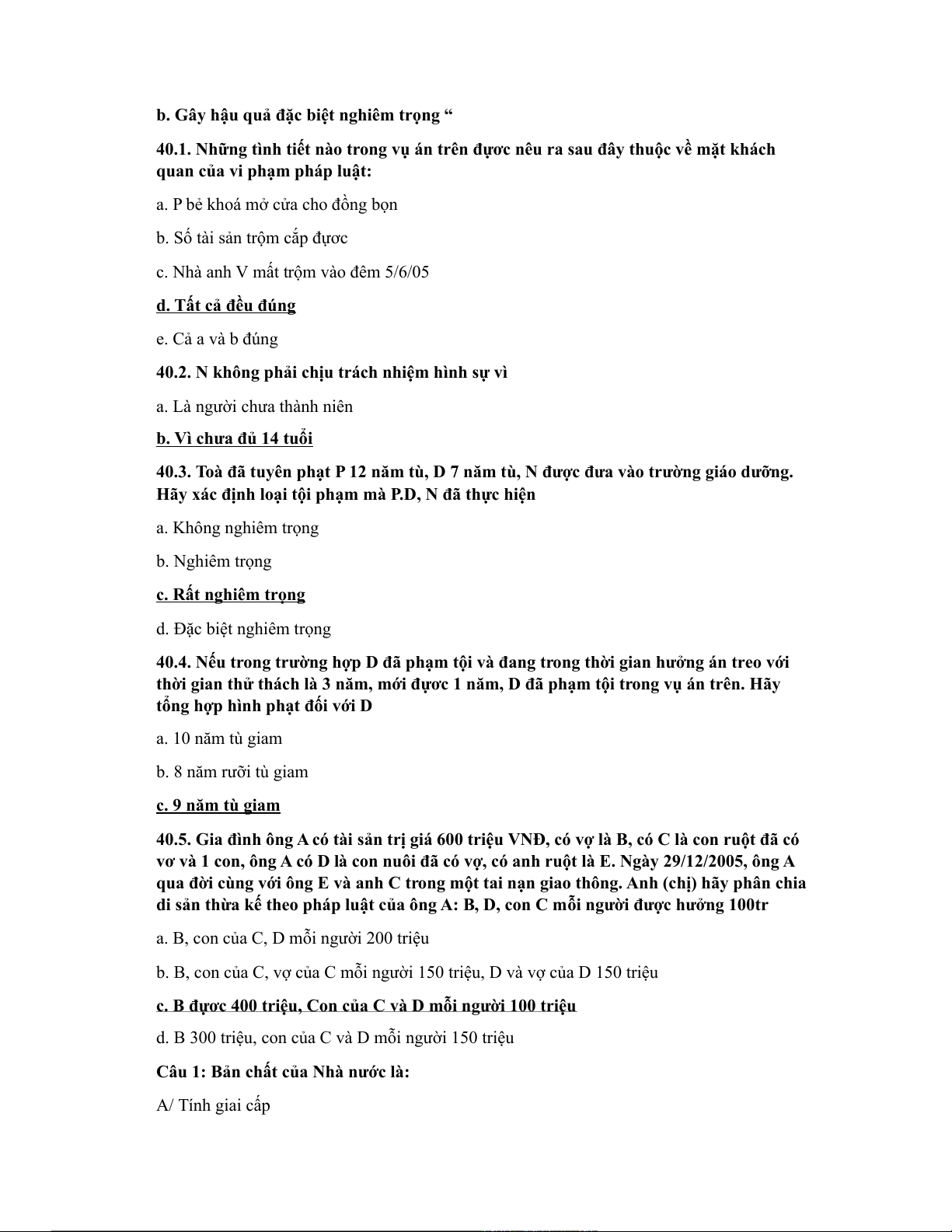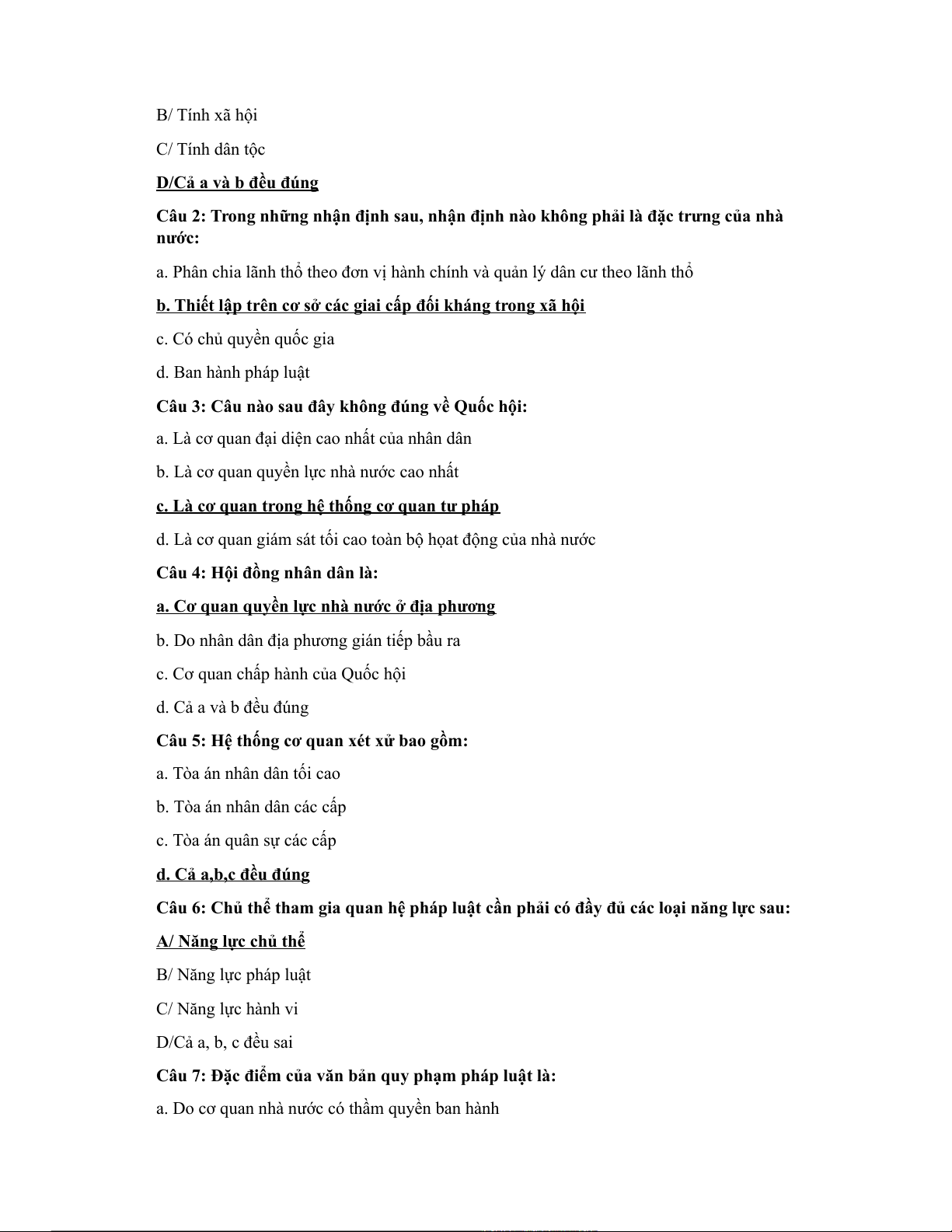 Câu 1: Bản chất của Nhà nước là: A/ Tính giai cấp B/ Tính xã hội C/ Tính dân tộc