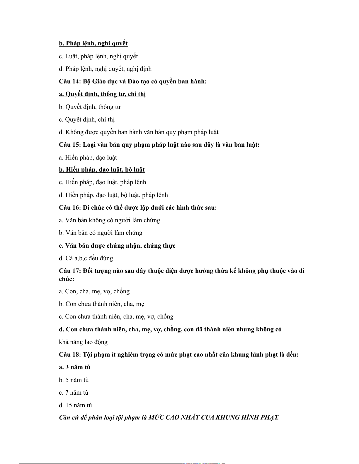 Câu 15: Loại văn bản quy phạm pháp luật nào sau đây là văn bản luật: a. Hiến pháp, đạo luật