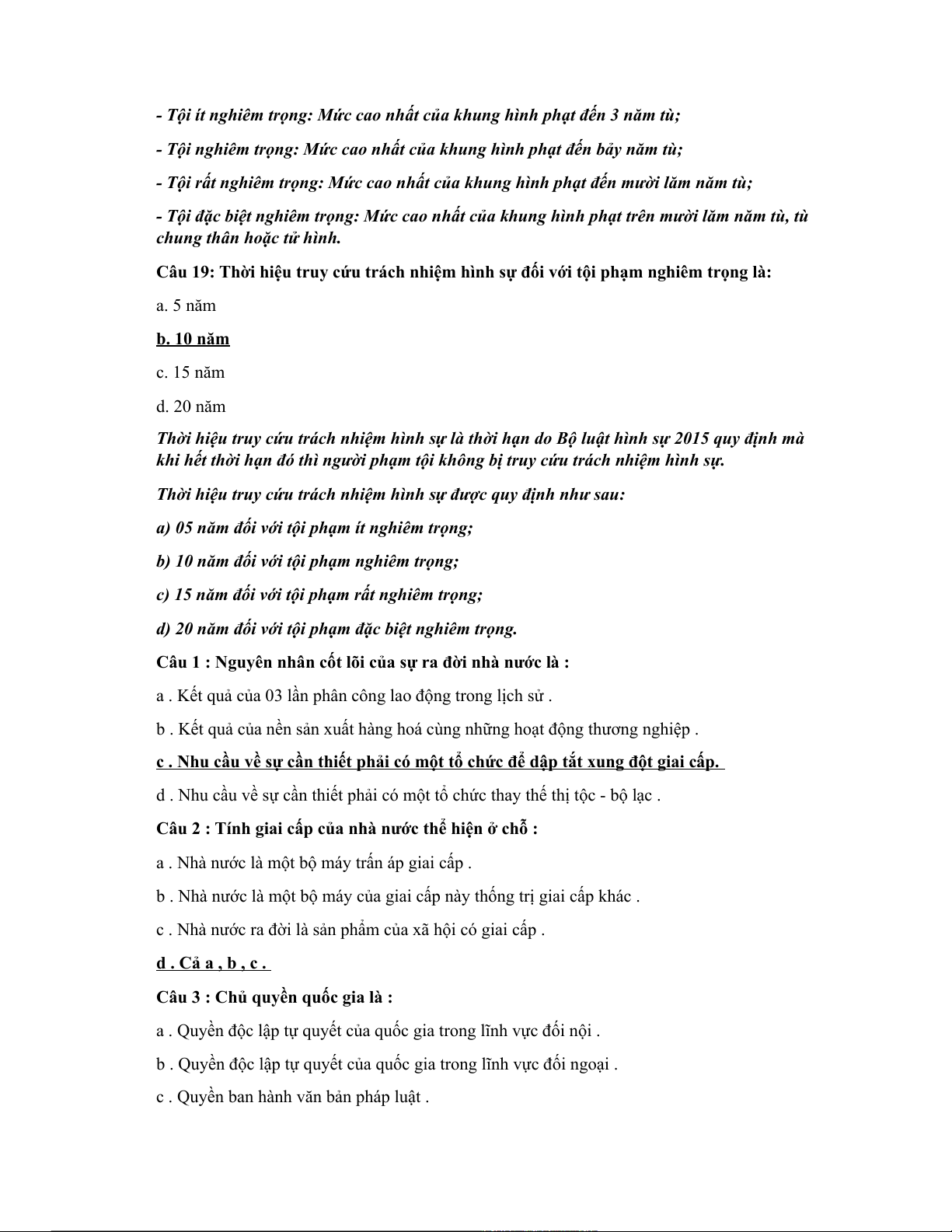 Câu 19: Thời hiệu truy cứu trách nhiệm hình sự đối với tội phạm nghiêm trọng là: a. 5 năm b. 10 năm c. 15 năm d. 20 năm