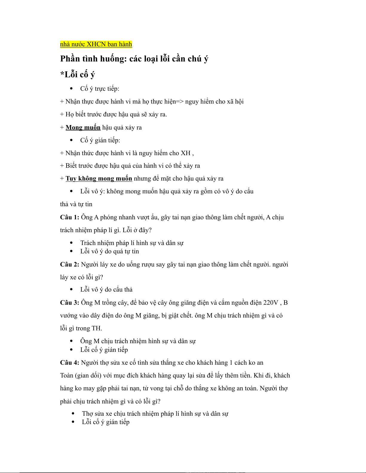 Câu 1: Ông A phóng nhanh vượt ẩu, gây tai nạn giao thông làm chết ngưởi, A chịu