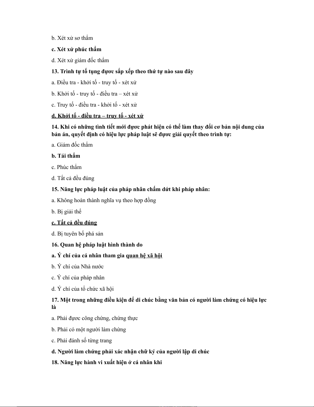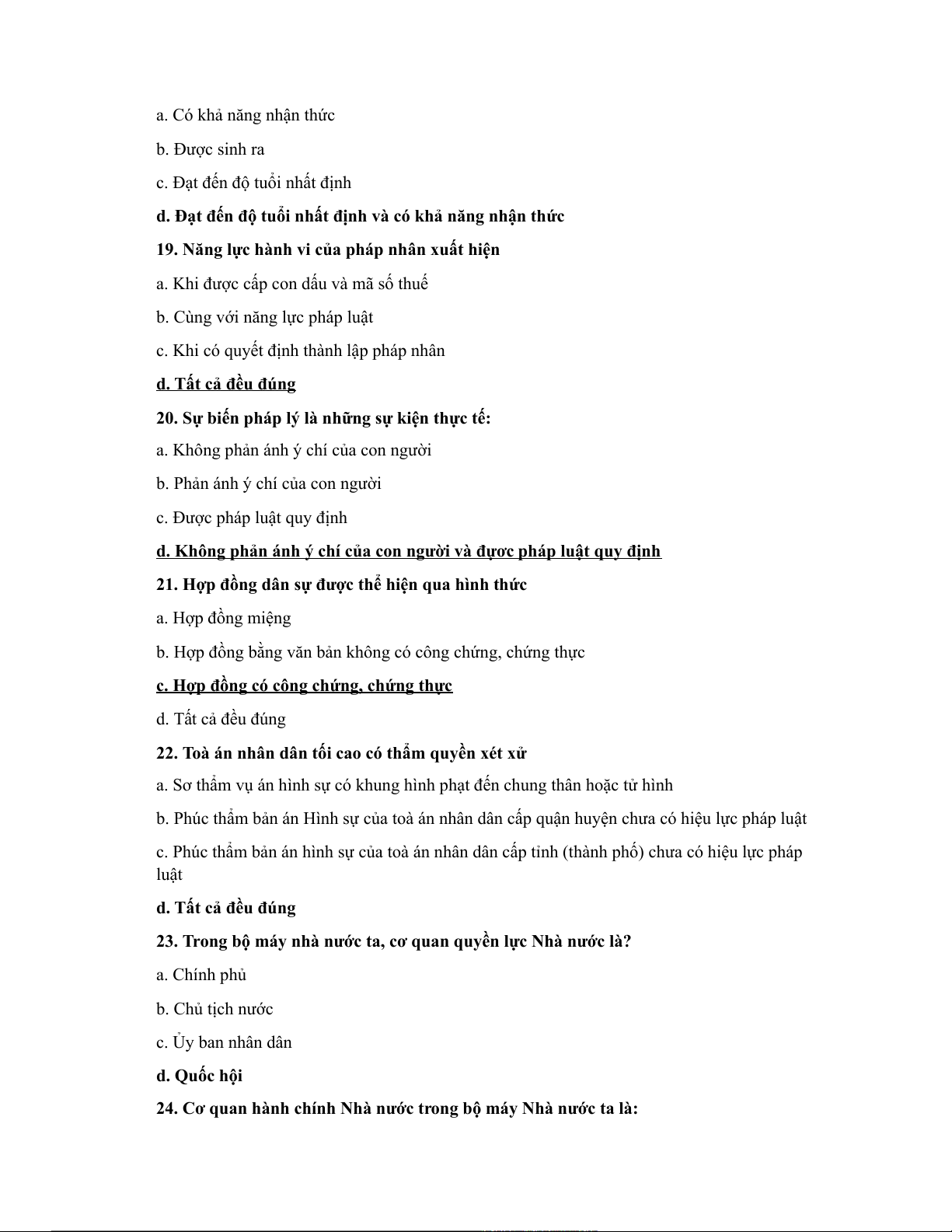 9. Thời điểm xuất hiện năng lực pháp luật của cá nhân được nhà nước công nhận a. 6 tuổi b. 16 tuổi c. 18 tuổi d. a,b,c, đều sai