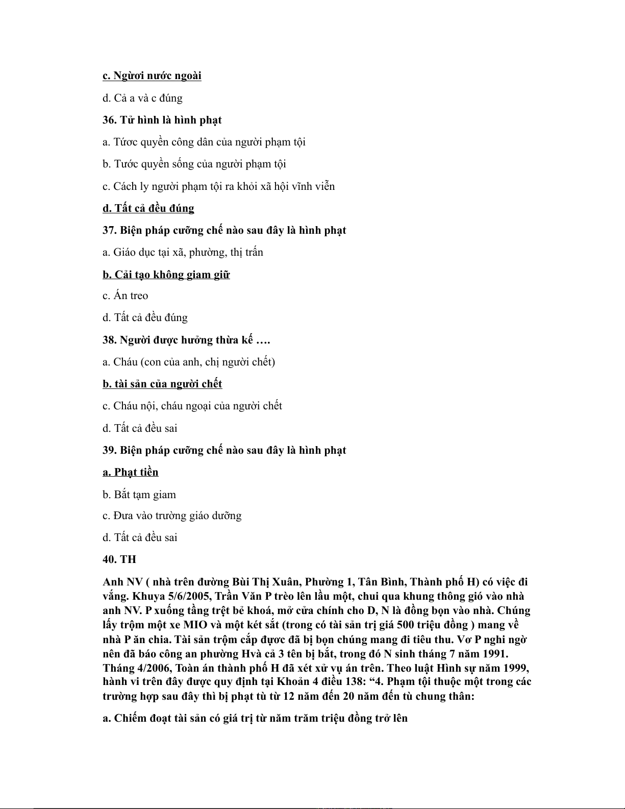 Câu 18: Tội phạm ít nghiêm trọng có mức phạt cao nhất của khung hình phạt là đến: a. 3 năm tù b. 5 năm tù c. 7 năm tù d. 15 năm tù