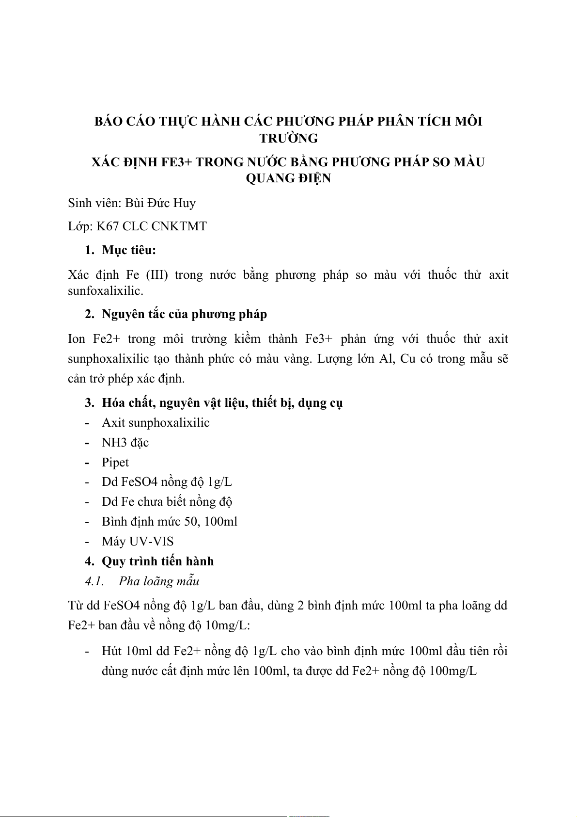 XÁC ĐỊNH FE3+ TRONG NƯỚC BẰNG PHƯƠNG PHÁP SO MÀU QUANG ĐIỆN Sinh viên: Bùi Đức Huy Lớp: K67 CLC CNKTMT 1. Mục tiêu: