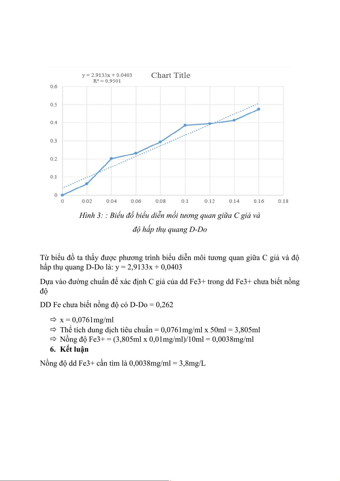 Nồng độ Fe3+ = (3,805ml x 0,01mg/ml)/10ml = 0,0038mg/ml 6. Kết luận