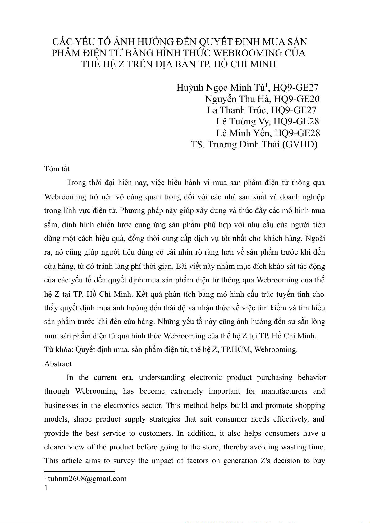 Từ khóa: Quyết định mua, sản phẩm điện tử, thế hệ Z, TP.HCM, Webrooming. Abstract