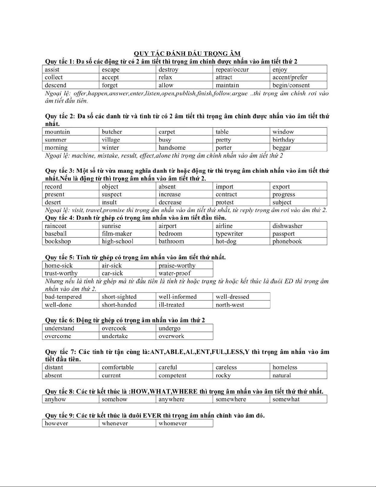 desert /ˈdez.ət/; rơi vào âm tiết thứ 2 khi là động từ: record /rɪˈkɔːd/; desert /dɪˈzɜːt/,…