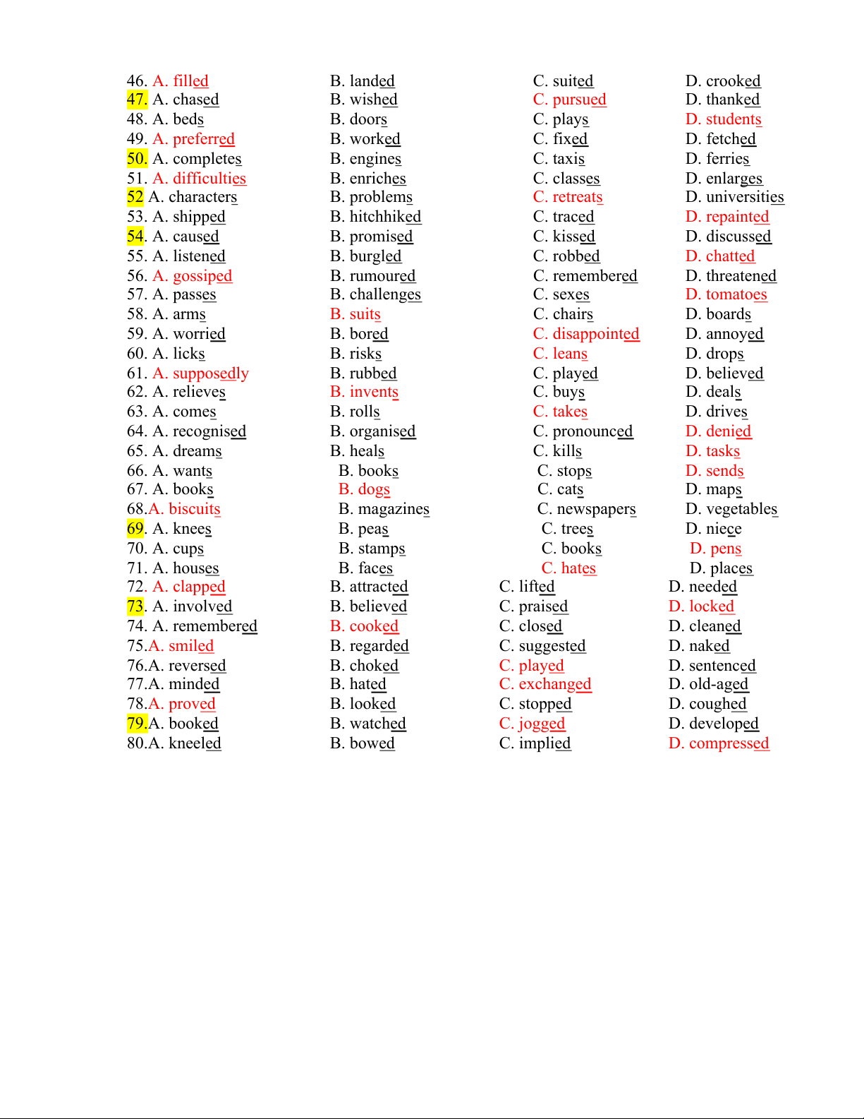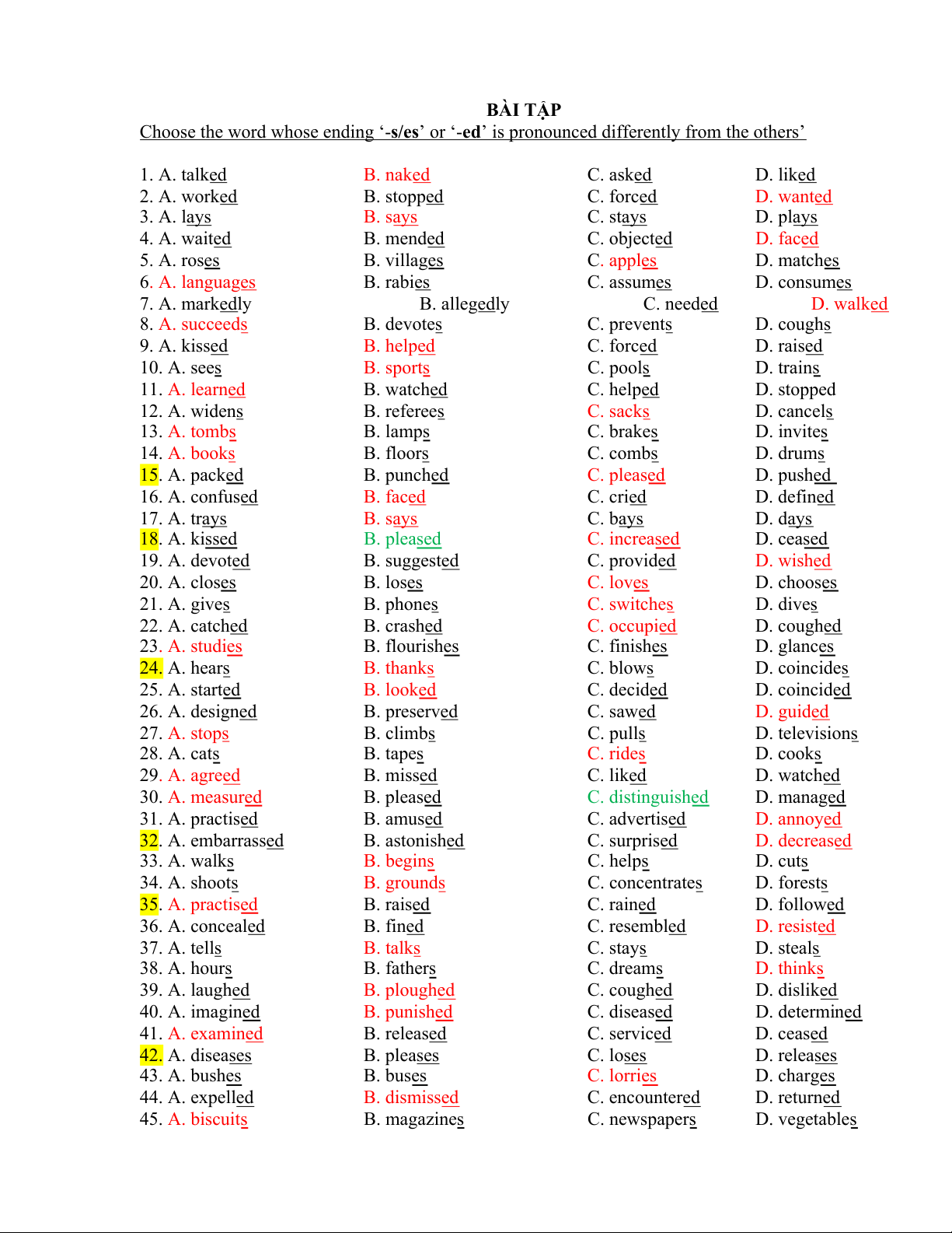 ’ is pronounced differently from the others’ 1. A. talked B. naked C. asked D. liked 2. A. worked B. stopped C. forced D. wanted 3. A. lays B. says C. stays D. plays 4. A. waited B. mended C. objected D. faced 5. A. roses B. villages C. apples D. matches 6. A. languages B. rabies C. assumes D. consumes 7. A. markedly B. allegedly C. needed D. walked 8. A. succeeds B. devotes C. prevents D. coughs 9. A. kissed B. helped C. forced D. raised 10. A. sees B. sports C. pools D. trains 11. A. learned B. watched C. helped D. stopped 12. A. widens B. referees C. sacks D. cancels 13. A. tombs B. lamps C. brakes D. invites 14. A. books B. floors C. combs D. drums 15. A. packed B. punched C. pleased D. pushed 16. A. confused B. faced C. cried D. defined 17. A. trays B. says C. bays D. days 18. A. kissed B. pleased C. increased D. ceased 19. A. devoted B. suggested C. provided D. wished 20. A. closes B. loses C. loves D. chooses 21. A. gives B. phones C. switches D. dives 22. A. catched B. crashed C. occupied D. coughed 23. A. studies B. flourishes C. finishes D. glances 24. A. hears B. thanks C. blows D. coincides 25. A. started B. looked C. decided D. coincided 26. A. designed B. preserved C. sawed D. guided 27. A. stops B. climbs C. pulls D. televisions 28. A. cats B. tapes C. rides D. cooks 29. A. agreed B. missed C. liked D. watched 30. A. measured B. pleased C. distinguished D. managed 31. A. practised B. amused C. advertised D. annoyed 32. A. embarrassed B. astonished C. surprised D. decreased 33. A. walks B. begins C. helps D. cuts 34. A. shoots B. grounds C. concentrates D. forests 35. A. practised B. raised C. rained D. followed 36. A. concealed B. fined C. resembled D. resisted 37. A. tells B. talks C. stays D. steals 38. A. hours B. fathers C. dreams D. thinks 39. A. laughed B. ploughed C. coughed D. disliked 40. A. imagined B. punished C. diseased D. determined 41. A. examined B. released C. serviced D. ceased 42. A. diseases B. pleases C. loses D. releases 43. A. bushes B. buses C. lorries D. charges 44. A. expelled B. dismissed C. encountered D. returned 45. A. biscuits B. magazines C. newspapers D. vegetables 46. A. filled B. landed C. suited D. crooked 47. A. chased B. wished C. pursued D. thanked 48. A. beds B. doors C. plays D. students 49. A. preferred B. worked C. fixed D. fetched 50. A. completes B. engines C. taxis D. ferries 51. A. difficulties B. enriches C. classes D. enlarges 52 A. characters B. problems C. retreats D. universities 53. A. shipped B. hitchhiked C. traced D. repainted 54. A. caused B. promised C. kissed D. discussed 55. A. listened B. burgled C. robbed D. chatted 56. A. gossiped B. rumoured C. remembered D. threatened 57. A. passes B. challenges C. sexes D. tomatoes 58. A. arms B. suits C. chairs D. boards 59. A. worried B. bored C. disappointed D. annoyed 60. A. licks B. risks C. leans D. drops 61. A. supposedly B. rubbed C. played D. believed 62. A. relieves B. invents C. buys D. deals 63. A. comes B. rolls C. takes D. drives 64. A. recognised B. organised C. pronounced D. denied 65. A. dreams B. heals C. kills D. tasks 66. A. wants B. books C. stops D. sends 67. A. books B. dogs C. cats D. maps 68.A. biscuits B. magazines C. newspapers D. vegetables 69. A. knees B. peas C. trees D. niece 70. A. cups B. stamps C. books D. pens 71. A. houses B. faces C. hates D. places 72. A. clapped B. attracted C. lifted D. needed 73. A. involved B. believed C. praised D. locked 74. A. remembered B. cooked C. closed D. cleaned 75.A. smiled B. regarded C. suggested D. naked 76.A. reversed B. choked C. played D. sentenced 77.A. minded B. hated C. exchanged D. old-aged 78.A. proved B. looked C. stopped D. coughed 79.A. booked B. watched C. jogged D. developed 80.A. kneeled B. bowed C. implied D. compressed