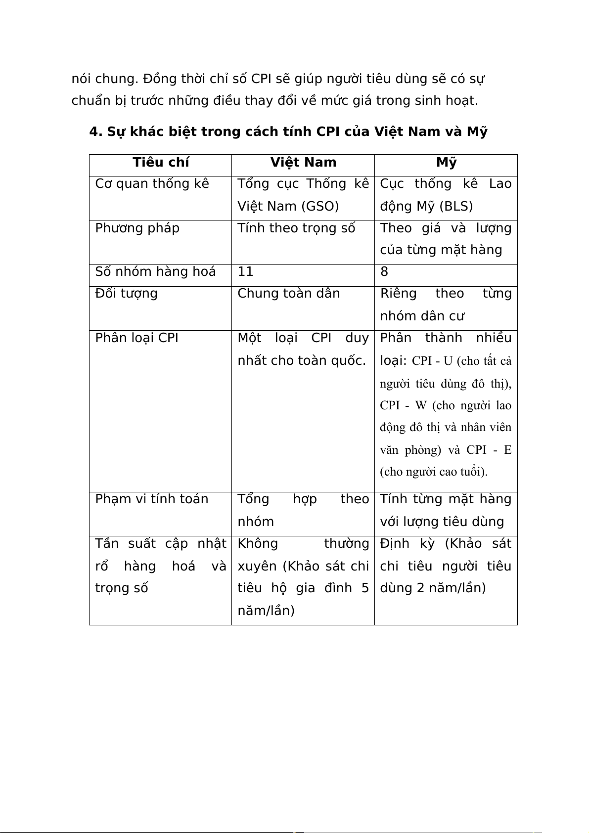 4. Sự khác biệt trong cách tính CPI của Việt Nam và Mỹ Tiêu chí Việt Nam Mỹ Cơ quan thống kê