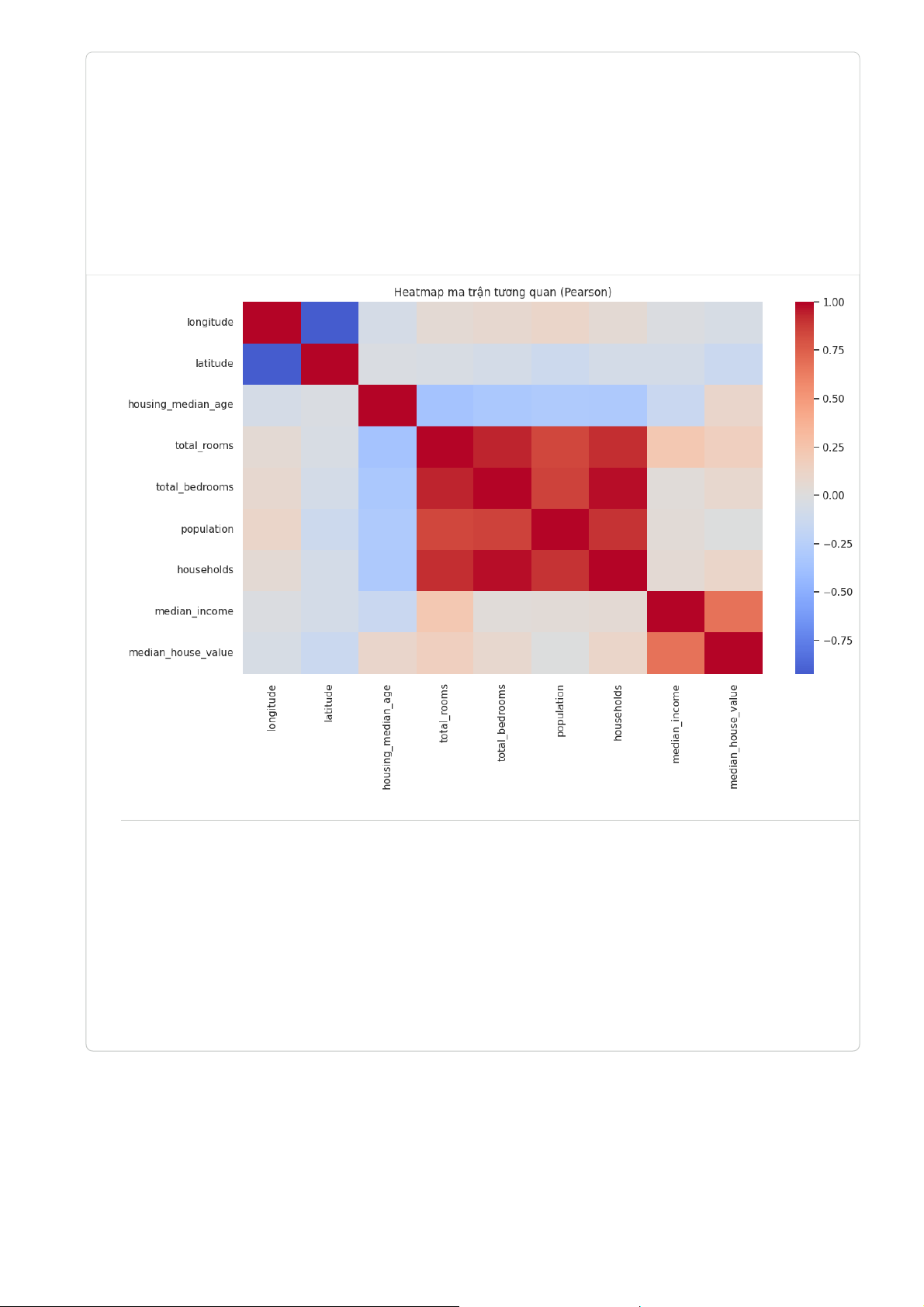 longitude latitude housing_median_age total_rooms total_bedrooms population households me longitude 1.000000 -0.925017 -0.064203 0.049865 0.070869 0.111572 0.051062 latitude -0.925017 1.000000 -0.025143 -0.039632 -0.068245 -0.117318 -0.068296 housing_median_age -0.064203 -0.025143 1.000000 -0.367850 -0.323154 -0.299888 -0.305171 total_rooms 0.049865 -0.039632 -0.367850 1.000000 0.937749 0.838867 0.914116 total_bedrooms 0.070869 -0.068245 -0.323154 0.937749 1.000000 0.856387 0.970758 population 0.111572 -0.117318 -0.299888 0.838867 0.856387 1.000000 0.895530 households 0.051062 -0.068296 -0.305171 0.914116 0.970758 0.895530 1.000000 median_income -0.018701 -0.072363 -0.144315 0.221249 0.024025 0.032361 0.048625 median_house_value -0.050662 -0.138428 0.091409 0.160427 0.082279 -0.001192 0.100176 Nhận xét