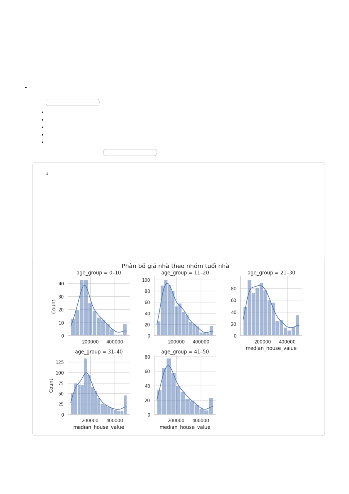 longitude latitude housing_median_age total_rooms total_bedrooms population households median_income med 0 -122.05 37.37 27.0 3885.0 661.0 1537.0 606.0 6.6085 1 -118.30 34.26 43.0 1510.0 310.0 809.0 277.0 3.5990 2 -117.81 33.78 27.0 3589.0 507.0 1484.0 495.0 5.7934 3 -118.36 33.82 28.0 67.0 15.0 49.0 11.0 6.1359 4 -119.67 36.33 19.0 1241.0 244.0 850.0 237.0 2.9375 Bài 1 – Pairplot Vẽ Pairplot cho: median_income housing_median_age median_house_value