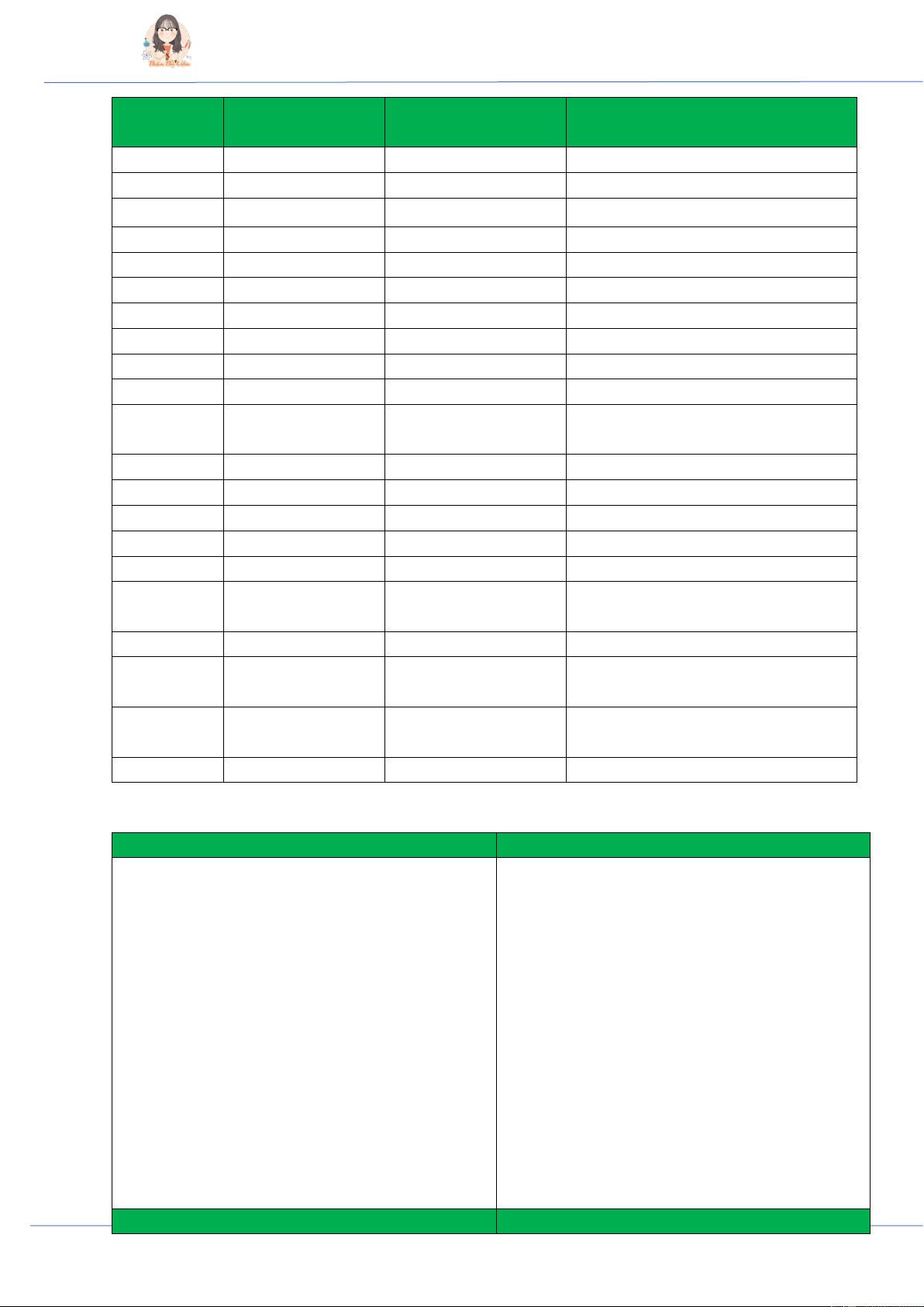 2k7 đăng kí khóa Live Vip chinh phục 9+ hóa inbox cho Cô nhé! GỐC TÊN GỐC PHIÊN ÂM VÍ DỤ MUỐI F -fluoride /ˈflɔːraɪd/ NaF: sodium fluoride Cl -chloride /ˈklɔːraɪd/ CuCl2: copper (II) chloride Br -bromide /ˈbrəʊmaɪd/ FeBr3: iron (III) bromide I -iodide /ˈaɪədaɪd/ AgI: silver iodide S -sulfide /ˈsʌlfaɪd/ PbS: lead sulfide C -carbide /ˈkɑːbaɪd/ Al4C3: aluminium carbide N -nitride /ˈnaɪtraɪd/ Li3N: lithium nitride P -phosphide /ˈfɒsfaɪd/ Zn3P2: zinc phosphide CN -cyanide /ˈsaɪənaɪd/ KCN: potassium cyanide SO4 -sulfate /ˈsʌlfeɪt/ Na2SO4: sodium sulfate KHSO4: potassium hydrogen HSO4 -hydrogen sulfate /ˈhaɪdrədʒən sʌlfeɪt/ sulfate SO3 -sulfite /ˈsʌlfaɪt/ CaSO3: calcium sulfite NO3 -nitrate /ˈnaɪtreɪt/ AgNO3: silver nitrate NO2 -nitrite /ˈnaɪtraɪt/ NaNO2: sodium nitrite MnO4 -permanganate /pəˈmæŋɡəˌneɪt/ KMnO4: potassium permanganate CO3 -carbonate /ˈkɑːbənət/ MgCO3: magnesium carbonate -hydrogen /ˈhaɪdrədʒən Ba(HCO3)2: barium hydrogen HCO3 carbonate ˈkɑːbənət/ carbonate PO4 -phosphate /ˈfɒsfeɪt/ Ag3PO4: silver phosphate -hydrogen (NH4)2HPO4: ammonium hydrogen HPO4