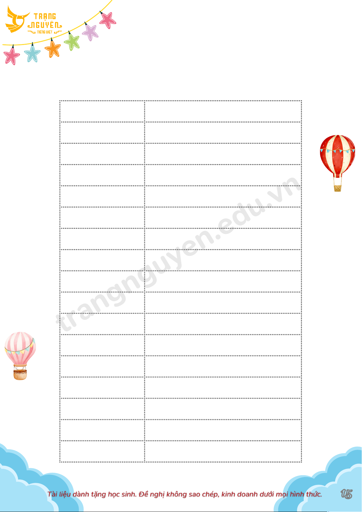 Phần 3: Cặp từ có nghĩa giống nhau 50 xinh xắn – xinh đẹp 51 bừa bãi – lộn xộn 52 lực lưỡng – vạm vỡ 53 lạc quan – yêu đời 54 nhộn nhịp – tấp nập 55 nguy nga – tráng lệ 56 gồ ghề – mấp mô 57 tiếng tăm – danh tiếng 58 yên ả – êm đềm 59 ích kỉ – hẹp hòi trangnguyen.edu.vn 60 gần gũi – thân thiết 61 siêng năng – cần cù 62 mảnh dẻ - thanh mảnh 63 mũm mĩm - mập mạp 64 gọn gàng - ngăn nắp 65 chân lí - lẽ phải 66 hấp dẫn - cuốn hút 14 1 www.trangnguyen.edu.vn