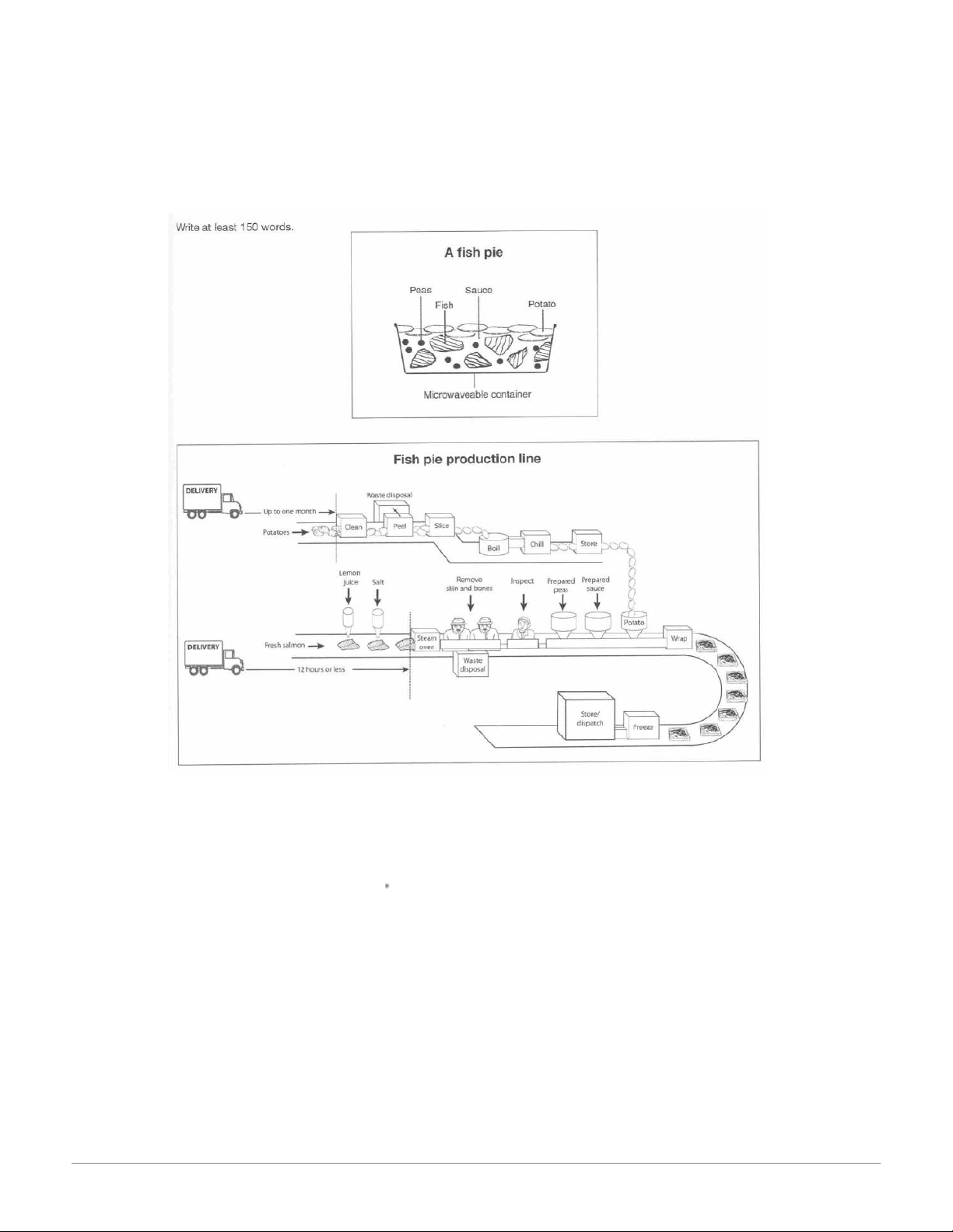 The diagrams below give information about the manufacture of frozen fish pies.