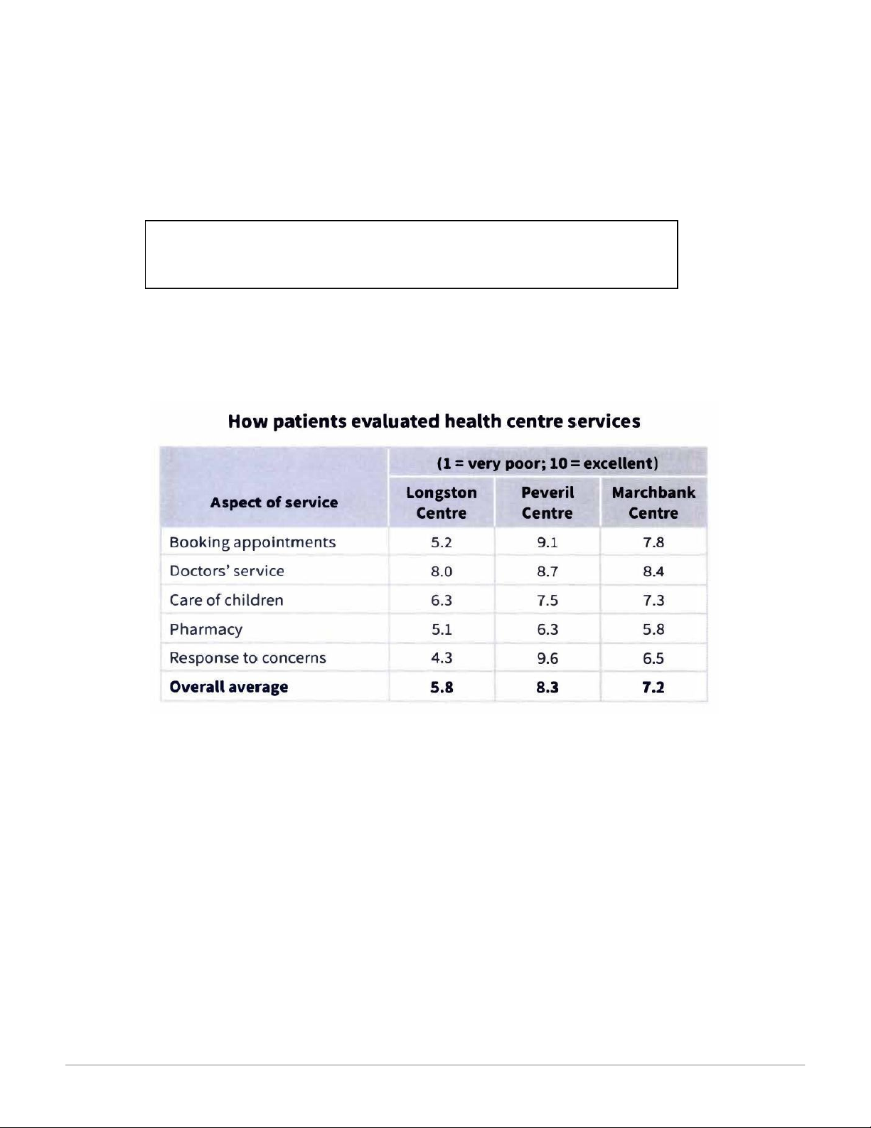 The table shows how patients evaluated different services at three health centres.