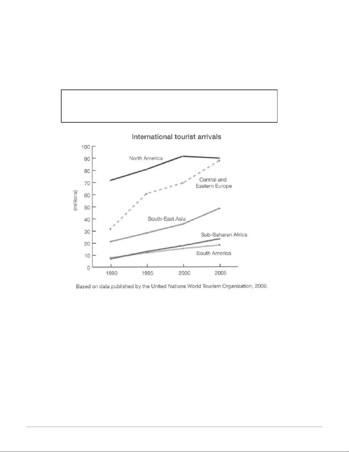 The graph below gives information about international tourist arrivals in different parts of the world.