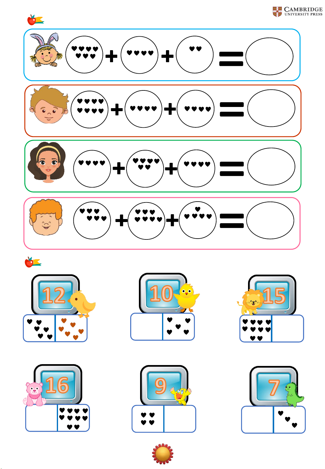 Exercise 2: Use the dice to help you add the numbers. six + four = ten ……………………. ……………………. 6 + 4 = 10 ……………………. ……………………. ……………………. ……………………. ……………………. …………………… …………………… …………………… 7
