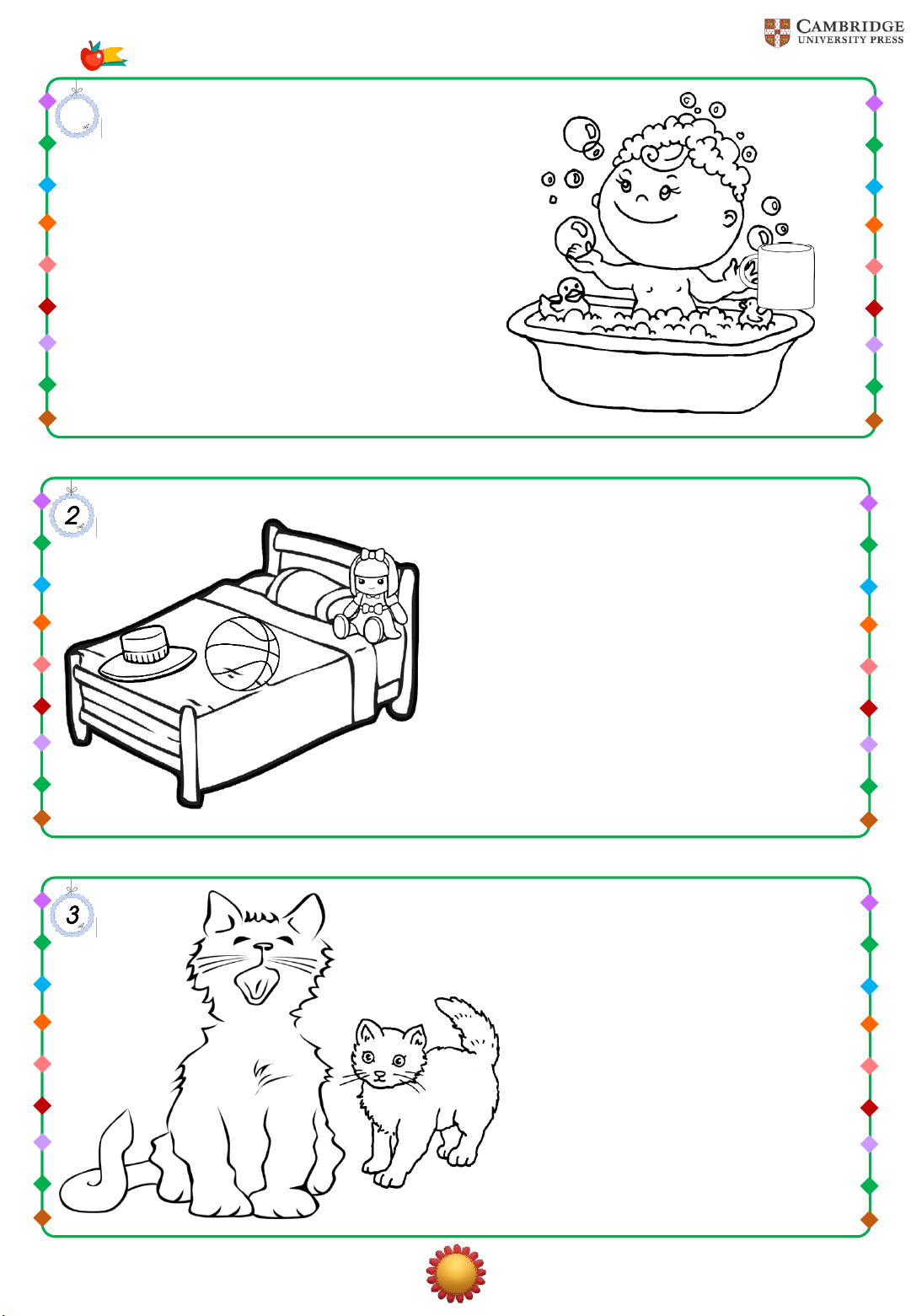 I have a hat, a ball and a doll. The hat is blue. The ball is green. The doll is yellow and purple. They are on my bed. 3 Cherry has two cats. The small cat is yellow. The big cat is purple. Cherry loves her two cats. 12 Exercise 4: Read and match. blue red purple yellow green