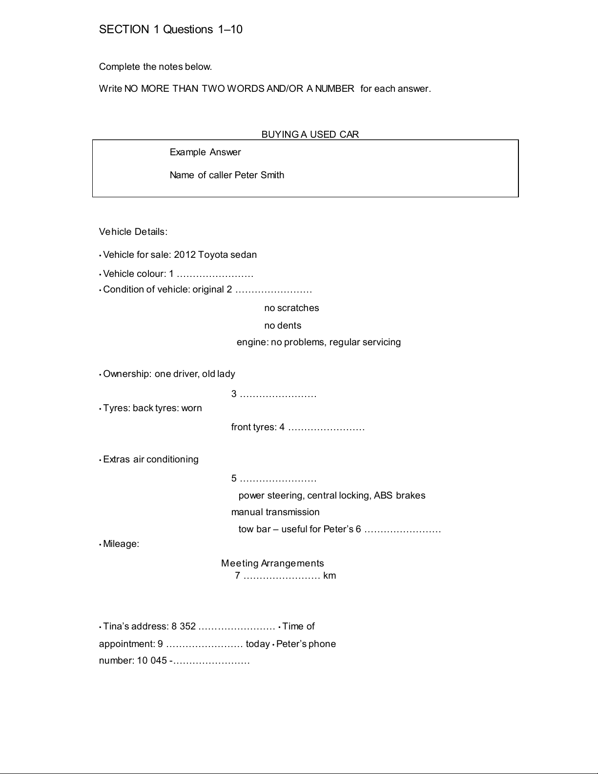 Write NO MORE THAN TWO WORDS AND/OR A NUMBER for each answer. BUYING A USED CAR Example Answer Name of caller Peter Smith Vehicle Details: