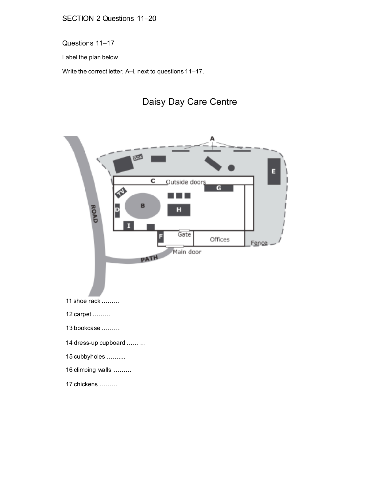 Write the correct letter, A–I, next to questions 11–17. Daisy Day Care Centre 11 shoe rack ……… 12 carpet ……… 13 bookcase ………
