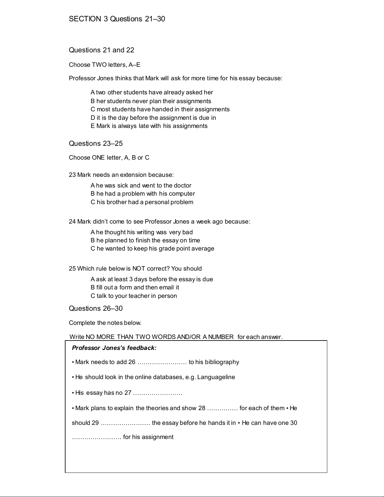 E Mark is always late with his assignments Questions 23–25 Choose ONE letter, A, B or C