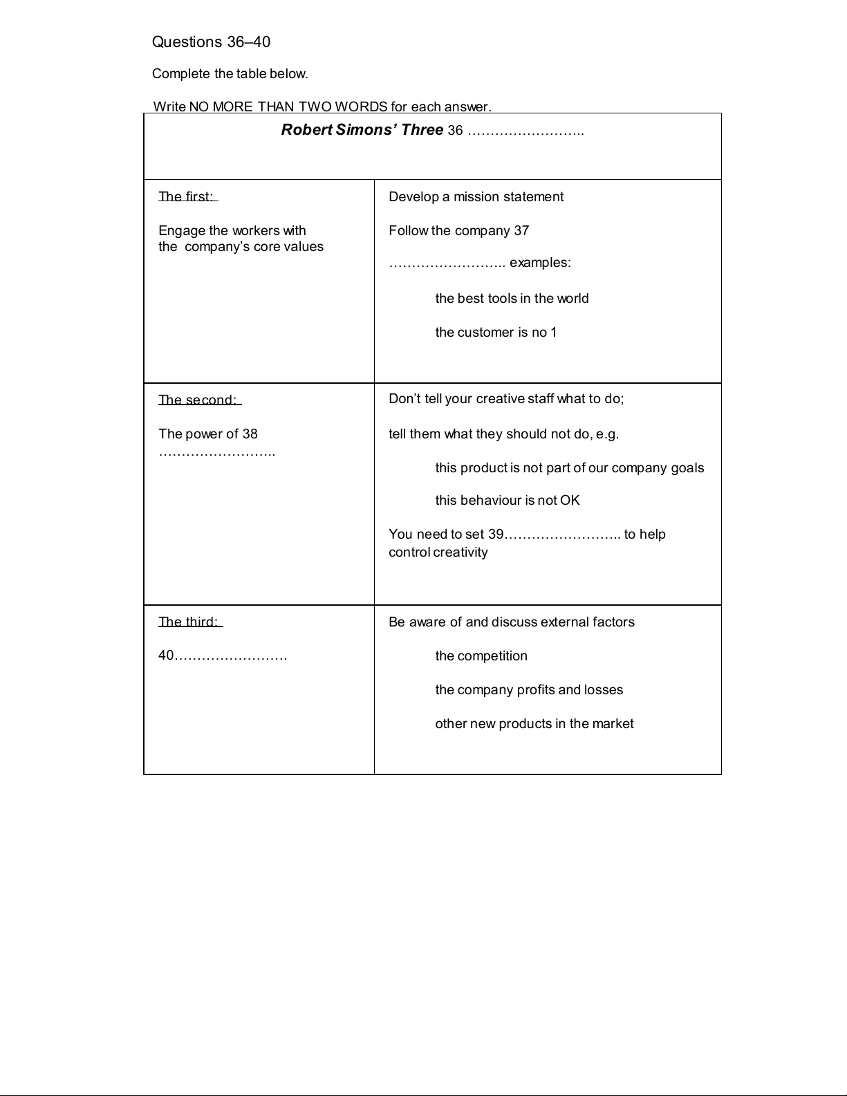 35 ……………….. and this can make the problem worse. Questions 36–40 Complete the table below.