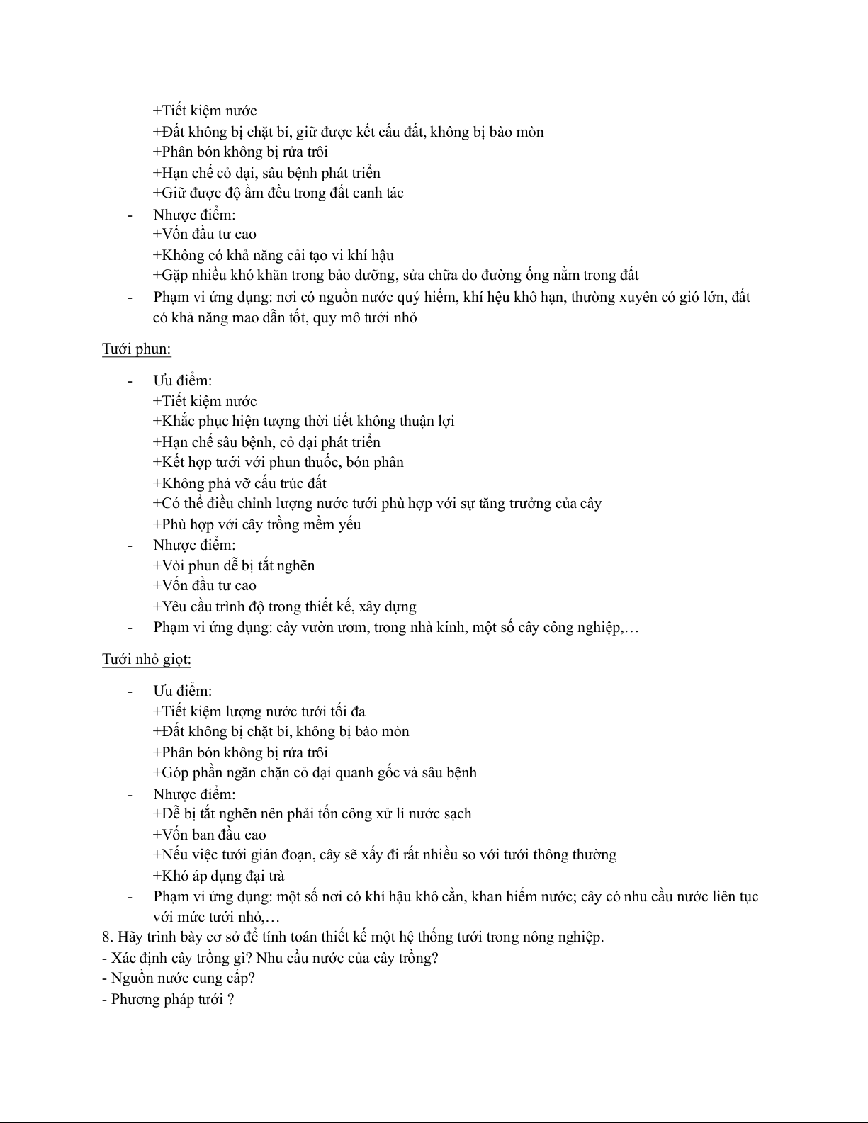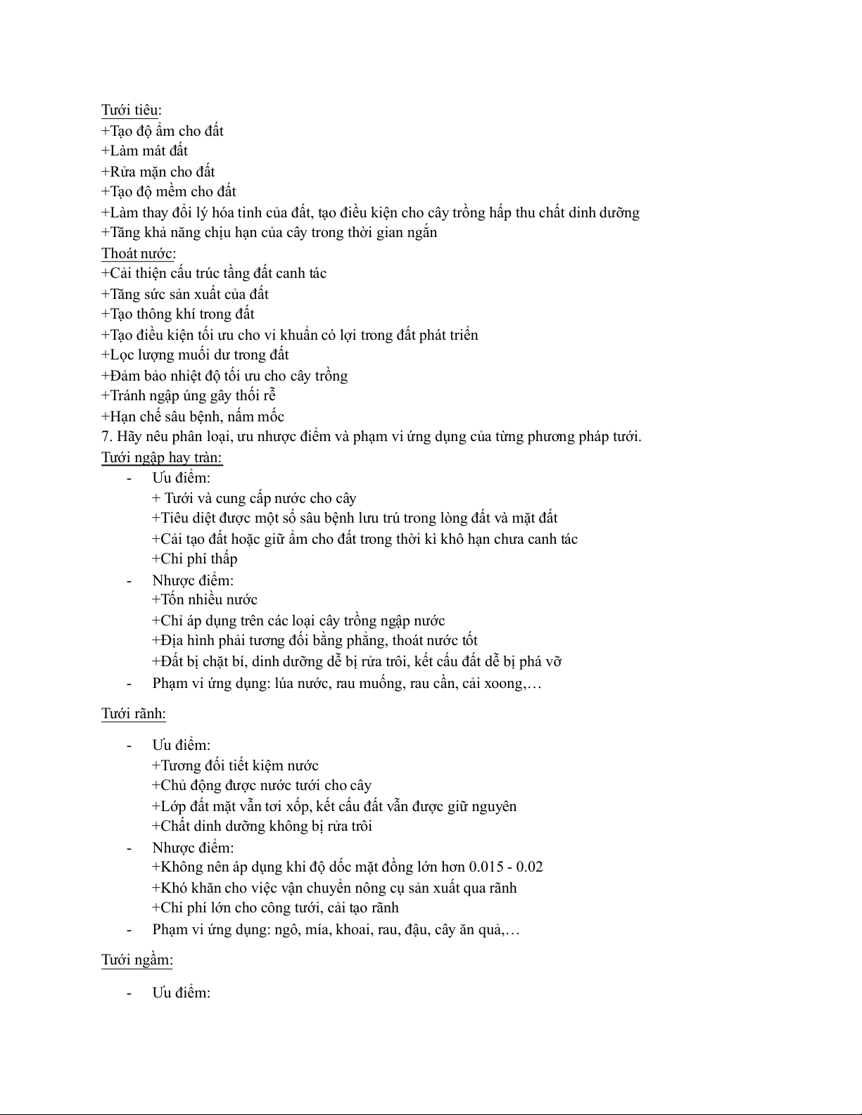 7. Hãy nêu phân loại, ưu nhược điểm và phạm vi ứng dụng của từng phương pháp tưới. Tưới ngập hay tràn: - Ưu điểm: