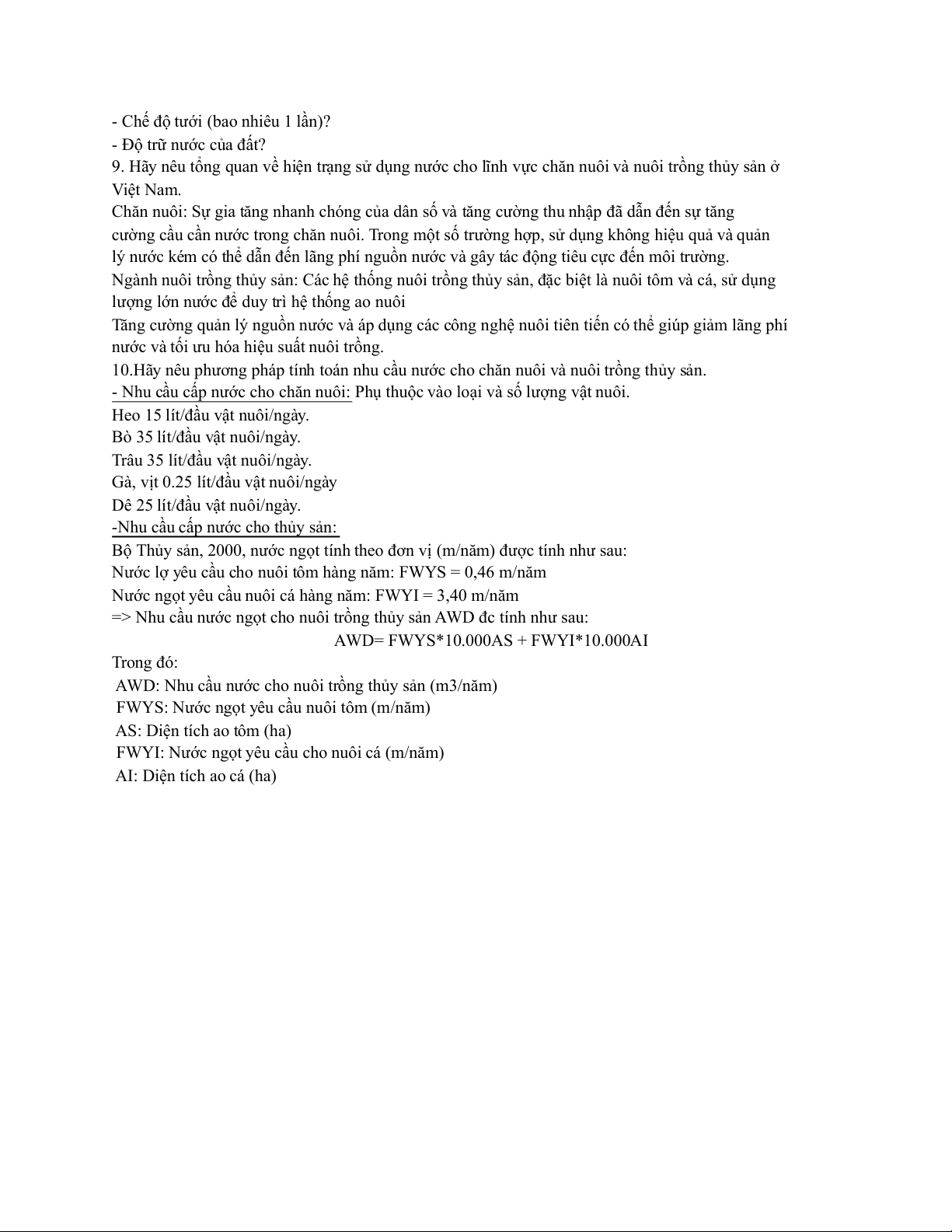 10.Hãy nêu phương pháp tính toán nhu cầu nước cho chăn nuôi và nuôi trồng thủy sản.