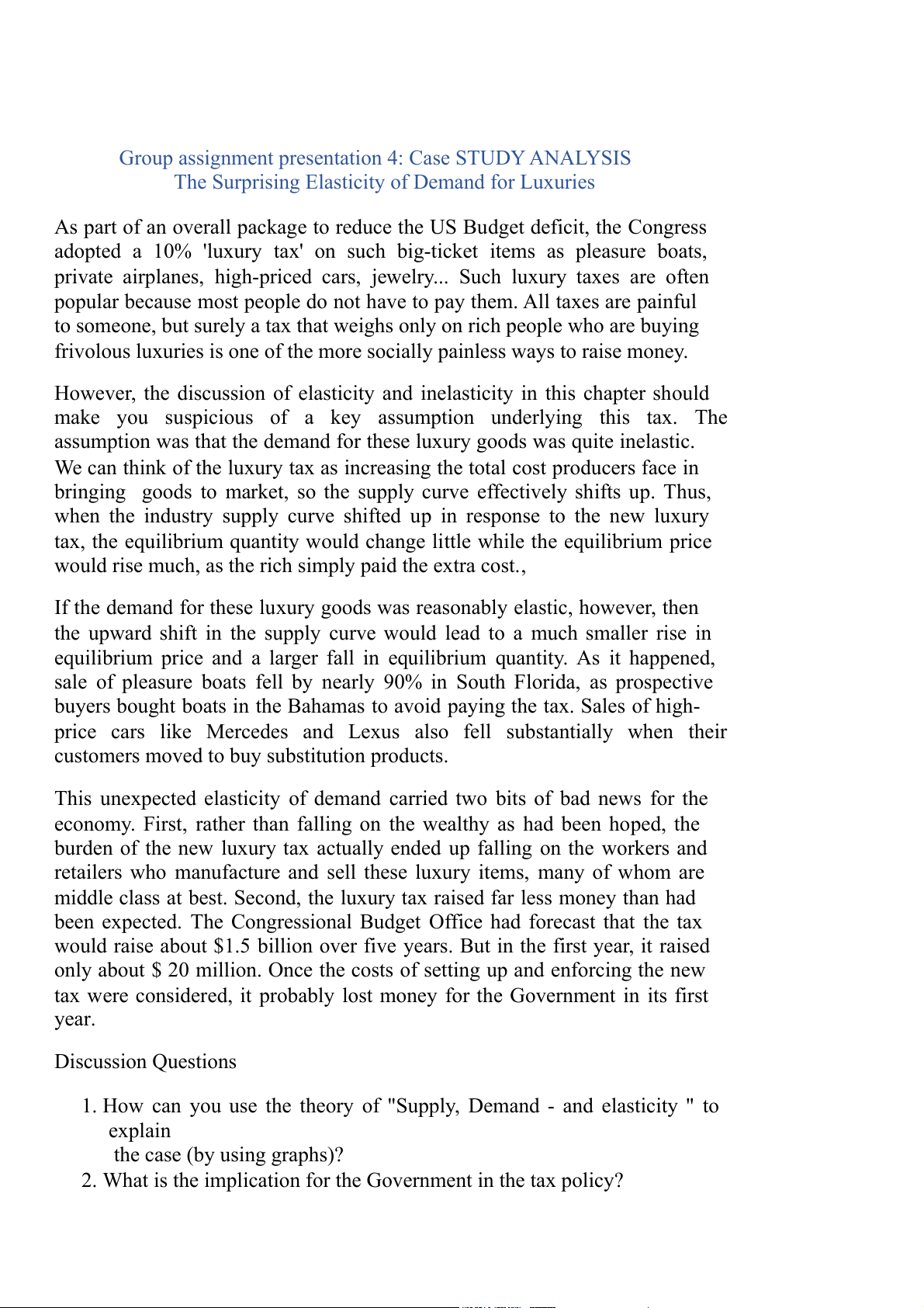 tax were considered, it probably lost money for the Government in its first year. Discussion Questions