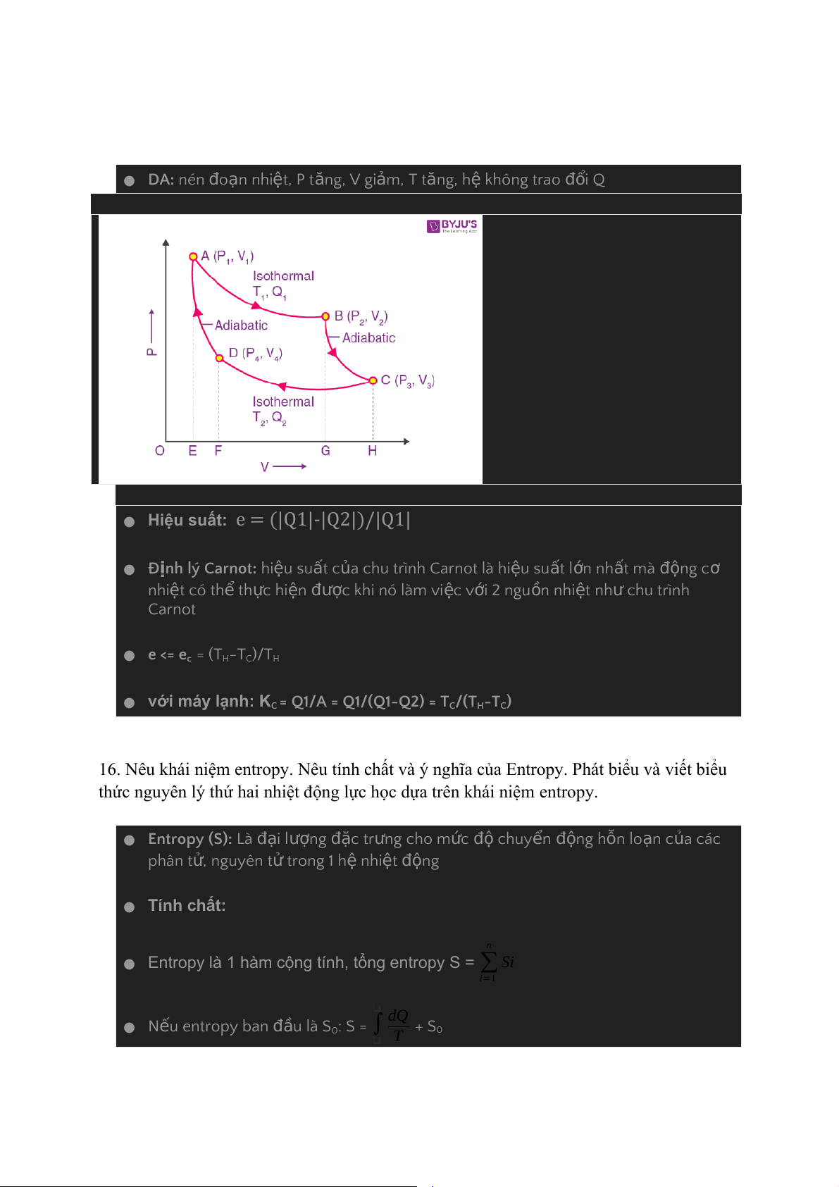 15. Chu trình Carnot: vẽ chu trình trên giản đồ P-V, trình bày vắn tắt về chu trình. Tính
