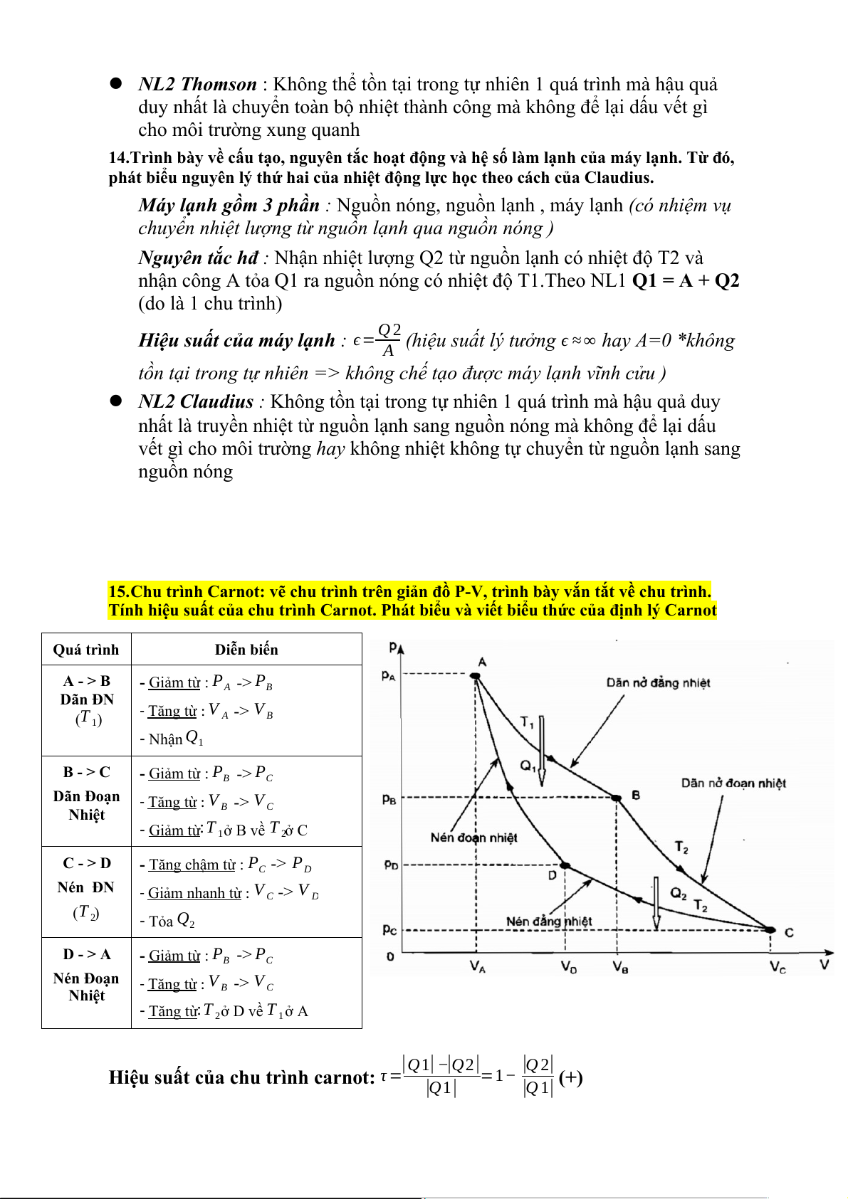 15.Chu trình Carnot: vẽ chu trình trên giản đồ P-V, trình bày vắn tắt về chu trình.