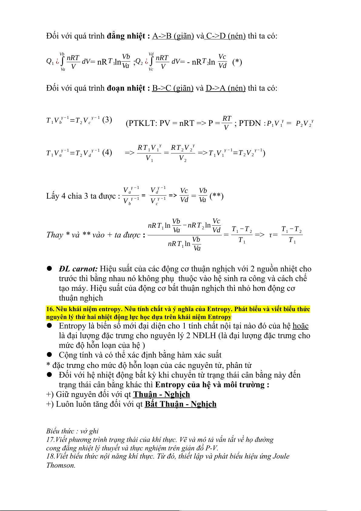 16. Nêu khái niệm entropy. Nêu tính chất và ý nghĩa của Entropy. Phát biểu và viết biểu thức