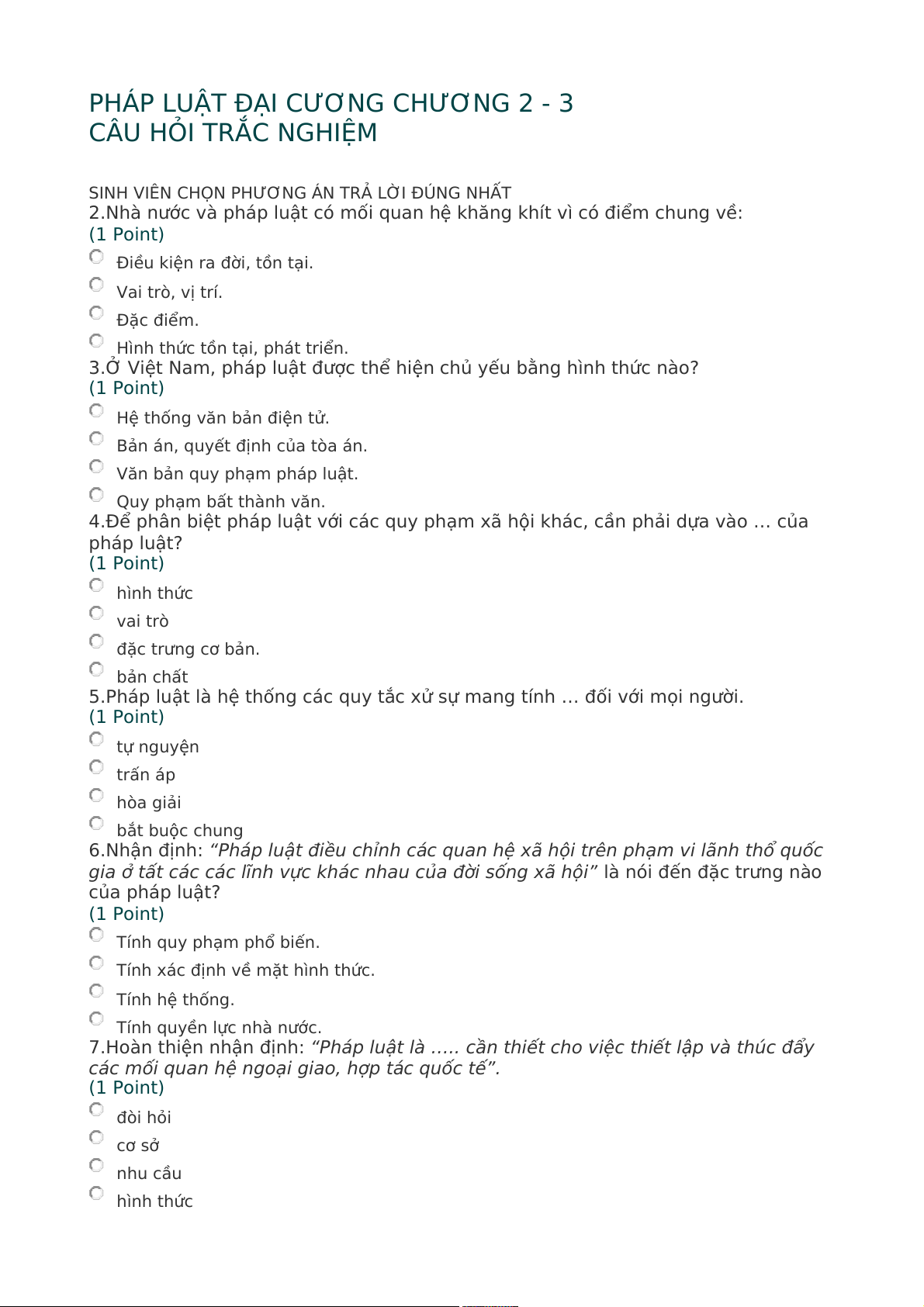 PHÁP LUẬT ĐẠI CƯƠNG CHƯƠNG 2 - 3 CÂU HỎI TRẮC NGHIỆM