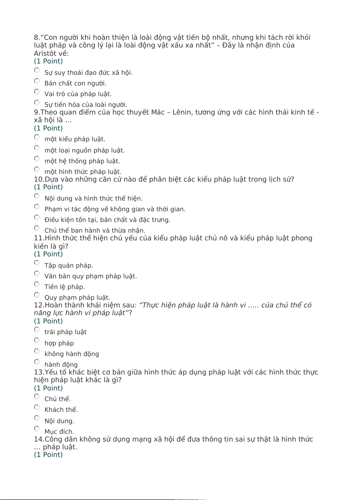 9.Theo quan điểm của học thuyết Mác – Lênin, tương ứng với các hình thái kinh tế - xã hội là … (1 Point) một kiểu pháp luật.