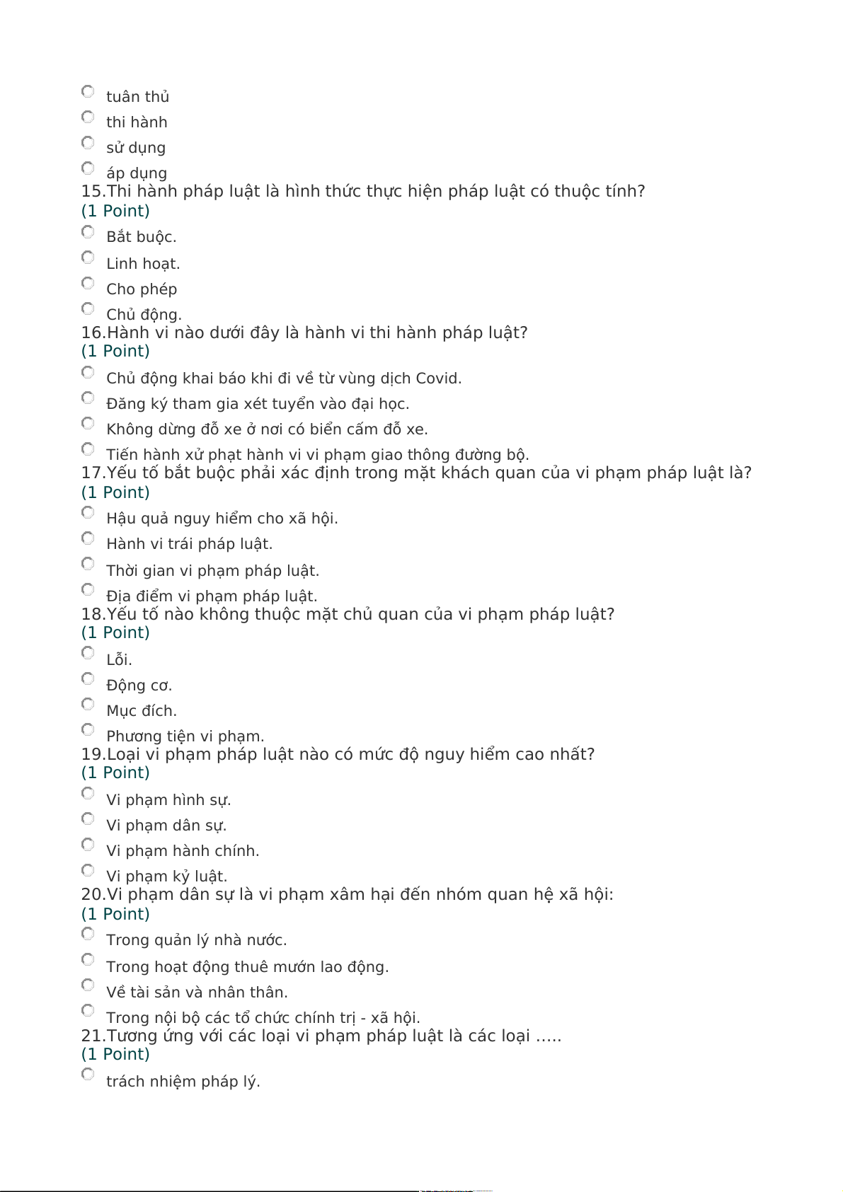 15.Thi hành pháp luật là hình thức thực hiện pháp luật có thuộc tính? (1 Point) Bắt buộc. Linh hoạt. Cho phép Chủ động.