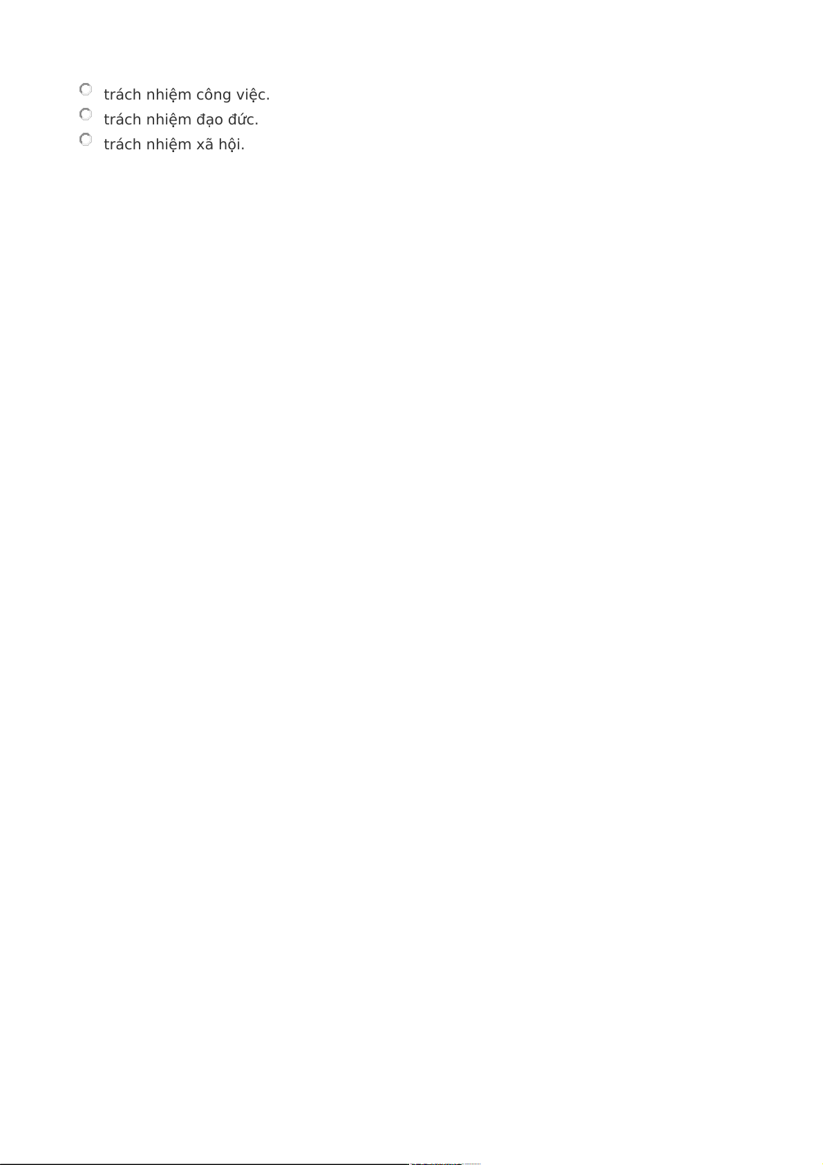 21.Tương ứng với các loại vi phạm pháp luật là các loại ….. (1 Point) trách nhiệm pháp lý. trách nhiệm công việc. trách nhiệm đạo đức. trách nhiệm xã hội.