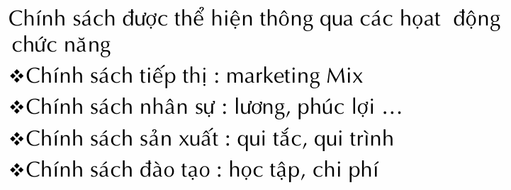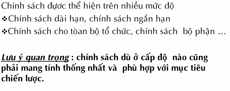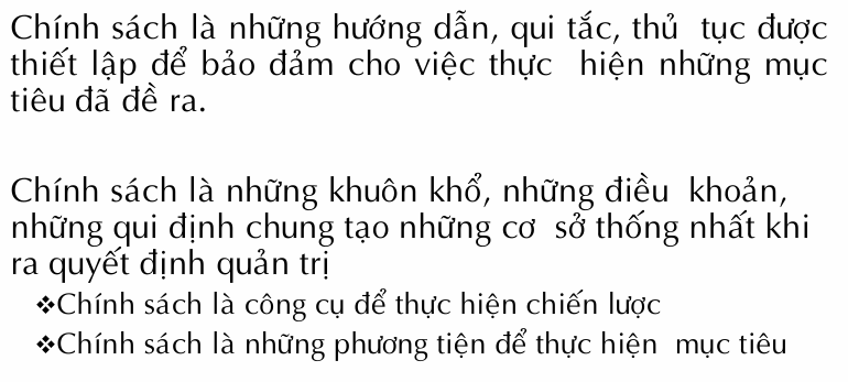 - Chính sách là công cụ để cụ thể hóa và triển khai các mục tiêu, nguyên tắc đã được thiết lập trong chiến lược.