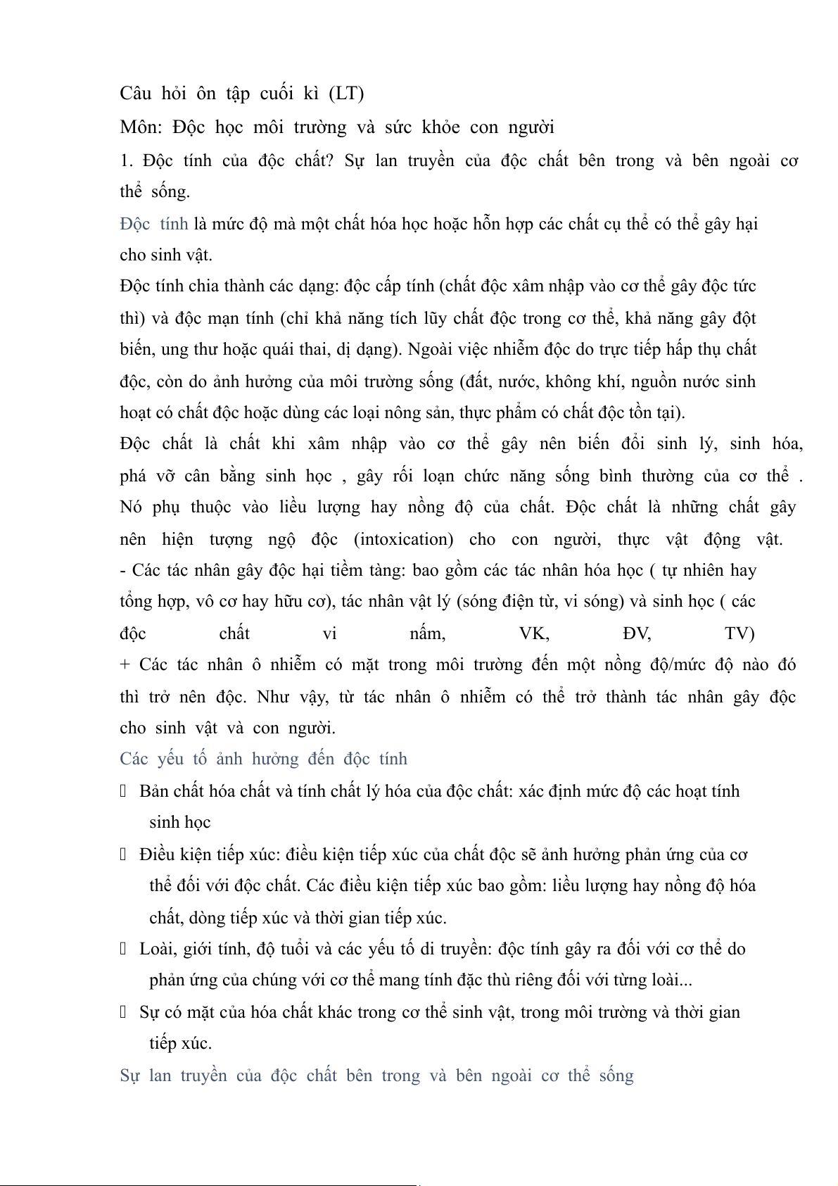 1. Độc tính của độc chất? Sự lan truyền của độc chất bên trong và bên ngoài cơ thể sống.