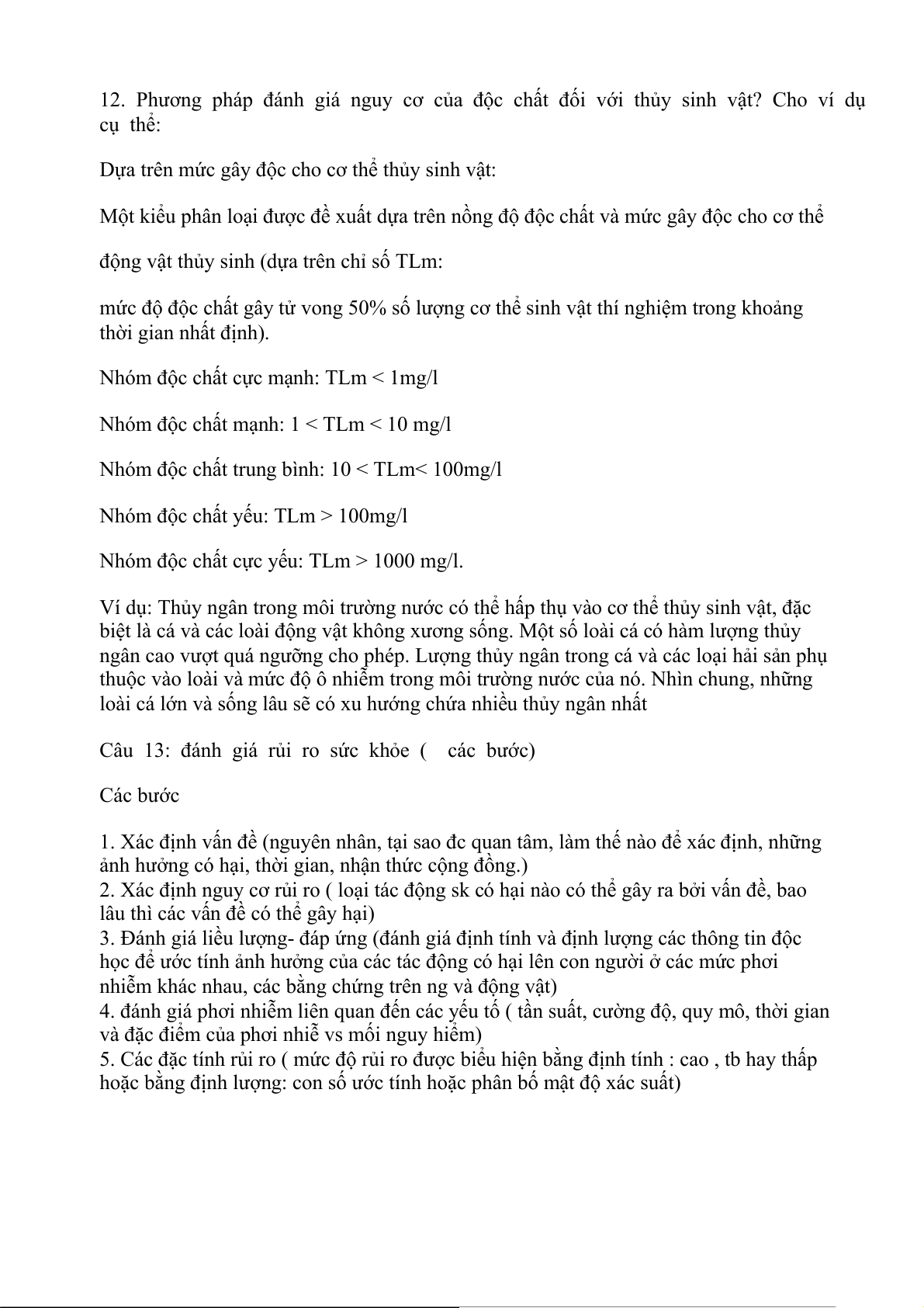 12. Phương pháp đánh giá nguy cơ của độc chất đối với thủy sinh vật? Cho ví dụ cụ thể: