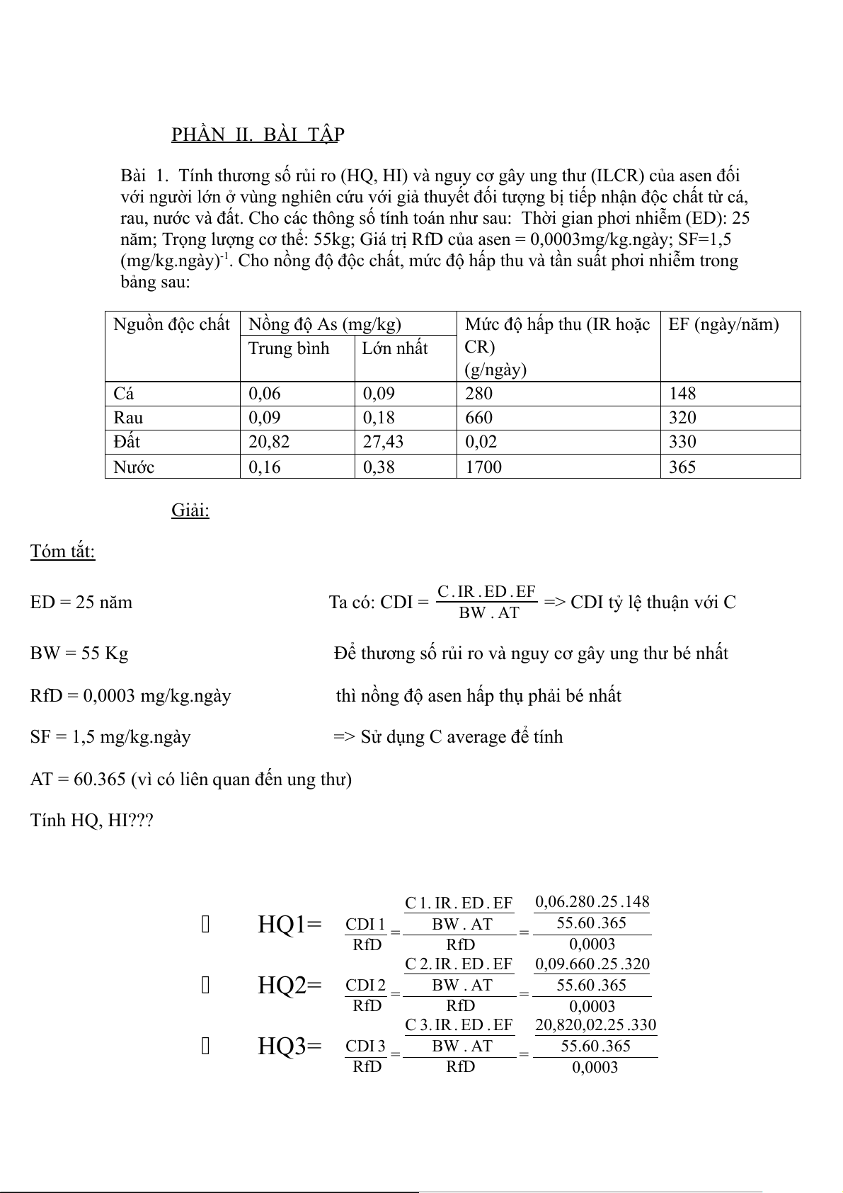 Bài 1. Tính thương số rủi ro (HQ, HI) và nguy cơ gây ung thư (ILCR) của asen đối