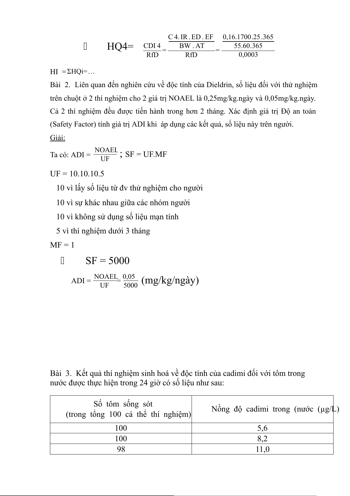 (Safety Factor) tính giá trị ADI khi áp dụng các kết quả, số liệu này trên người. Giải: NOAEL Ta có: ADI = ; SF = UF.MF UF UF = 10.10.10.5