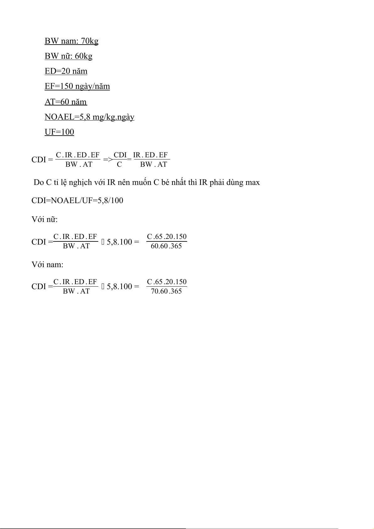 Do C tỉ lệ nghịch với IR nên muốn C bé nhất thì IR phải dùng max CDI=NOAEL/UF=5,8/100 Với nữ: C . IR . ED . EF C .65 .20.150 CDI = BW . AT 5,8.100 = 60.60 .365 Với nam: C . IR . ED . EF C .65 .20.150 CDI = 5,8.100 = BW . AT 70.60 .365