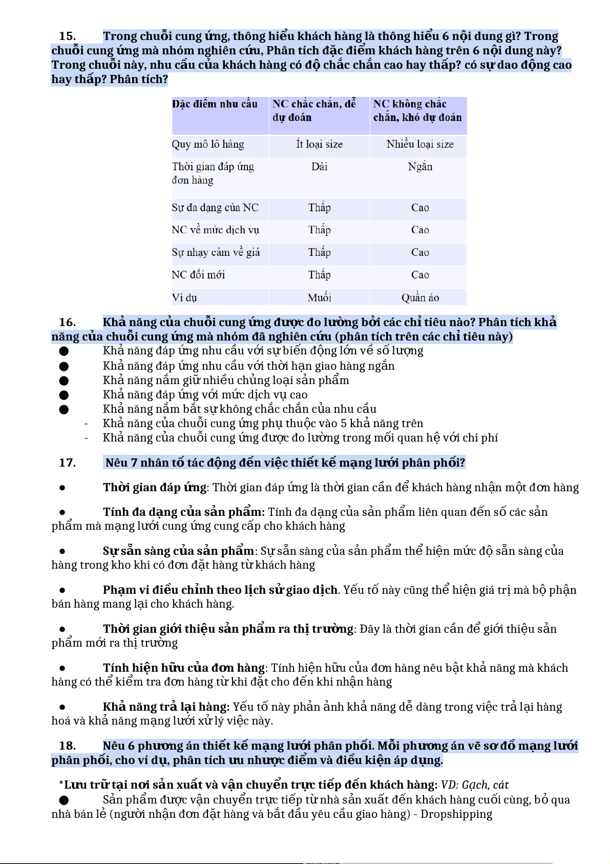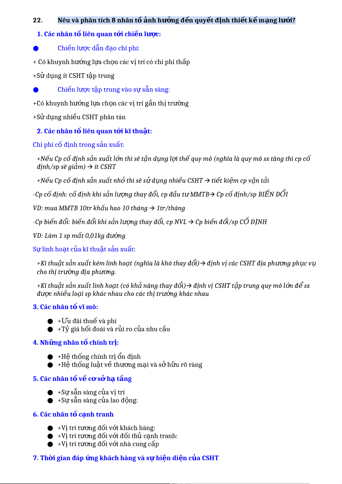 ứ (phân tích trên các ch ỉtiêu này) ● Kh ả năng đáp n ứ g nhu c u ầ v i ớ s ự bi n ế đ n ộ g l n ớ v ề s ố l n ượ g ● Kh ả năng đáp n ứ g nhu c u ầ v i ớ th i ờ h n ạ giao hàng ng n ắ ● Kh ả năng n m ắ gi ữ nhi u ề ch n ủ g lo i ạ s n ả ph m ẩ ● Kh ả năng đáp n ứ g v i ớ m c ứ d ch ị v ụ cao ● Kh ả năng n m ắ b t ắ s ự không ch c ắ ch n ắ c a ủ nhu c u ầ - Kh ả năng c a ủ chu i ỗ cung n ứ g ph ụ thu c ộ vào 5 kh ả năng trên - Kh ả năng c a ủ chu i ỗ cung n ứ g đ c ượ đo lường trong m i ố quan h ệ v i ớ chi phí 17. Nêu 7 nhân t ố tác động đ n ế vi c ệ thiết k ế mạng l i ướ phân ph i ố ? ●