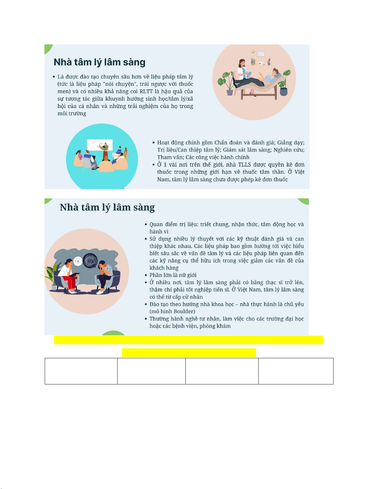 BẢNG SO SÁNH GIỮA BÁC SĨ TÂM THÂN, NHÀ TÂM LÝ LÂM SÀNG VÀ NHÀ