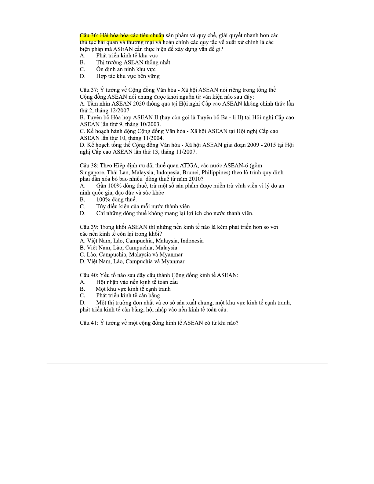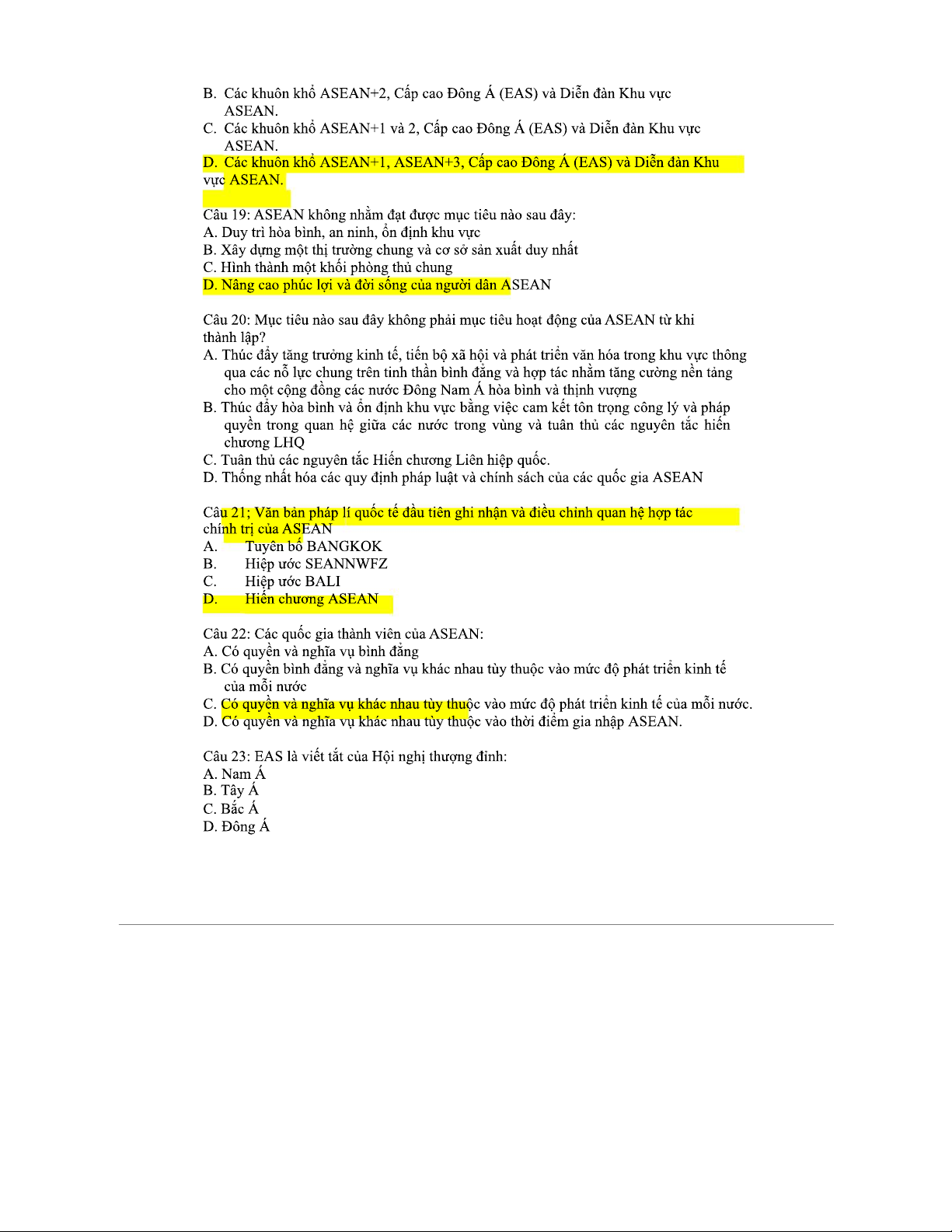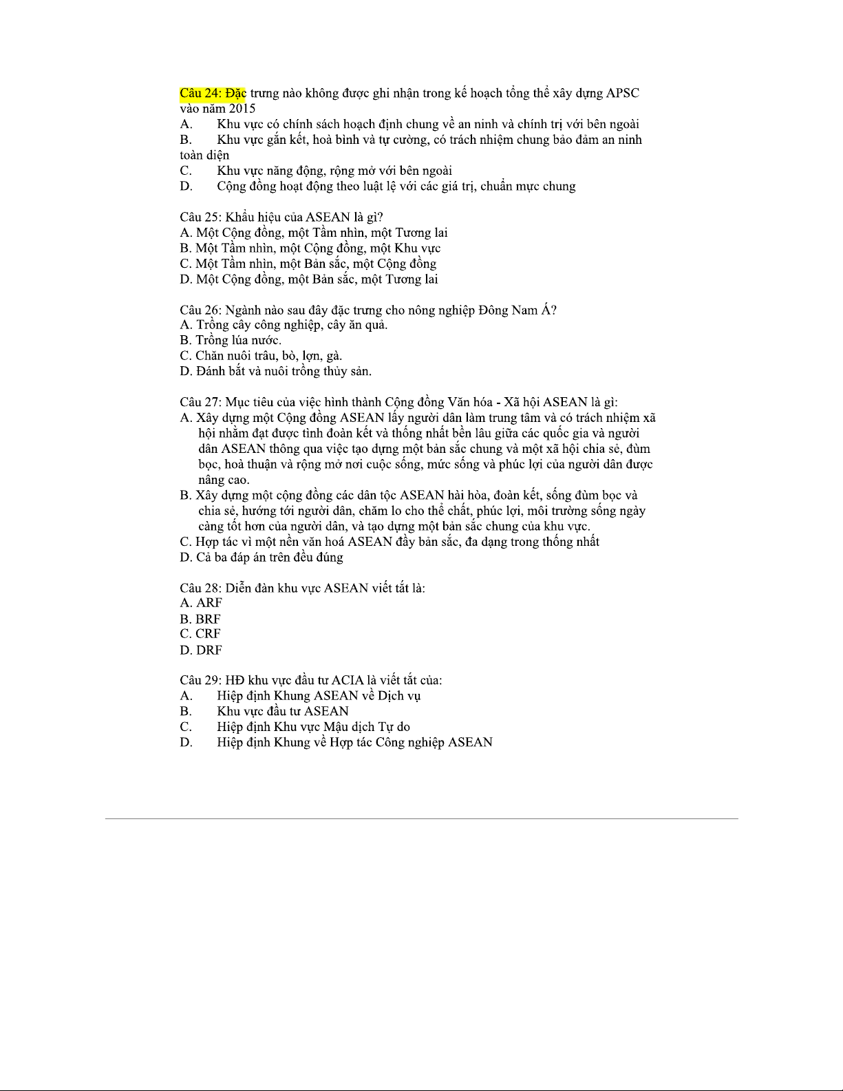 CÂU HỎI ÔN TẬP Cuối Kỳ Môn ASEAN: Trắc Nghiệm 2023
