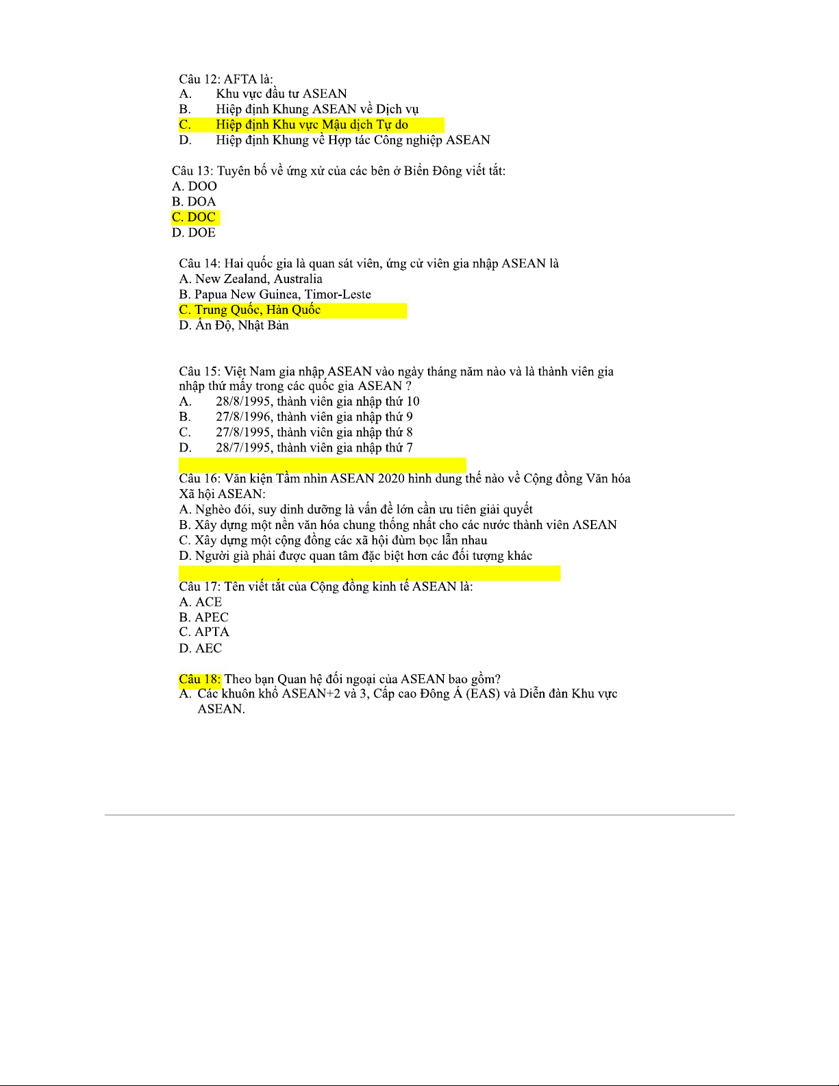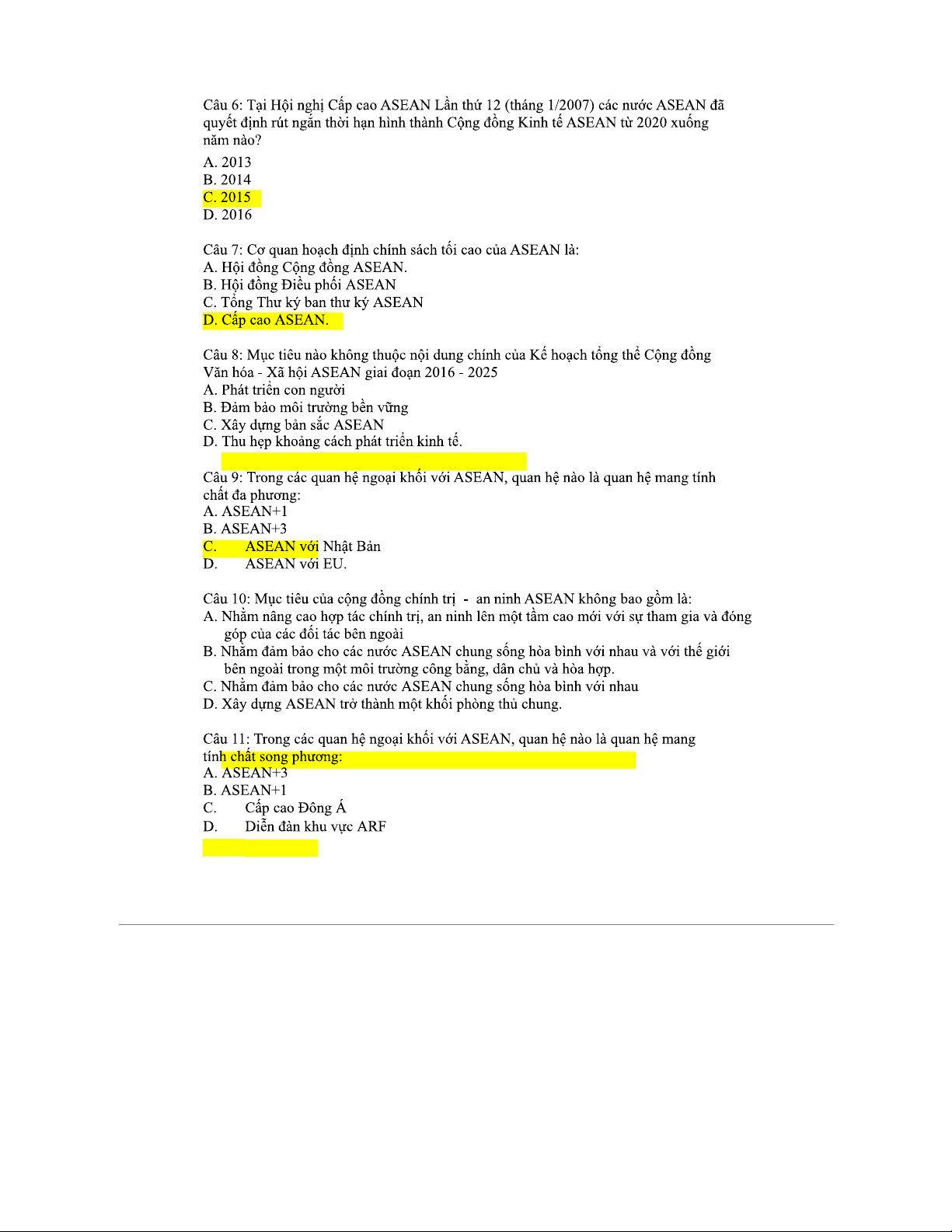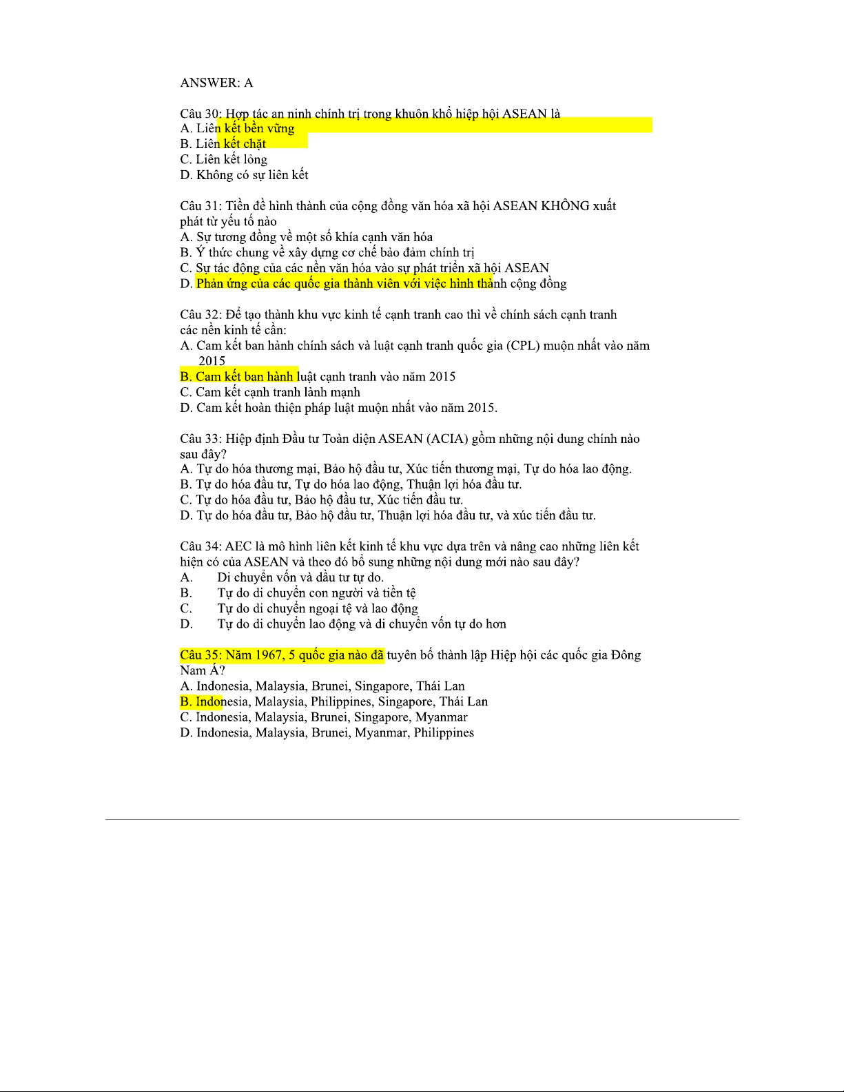 CÂU HỎI ÔN TẬP Cuối Kỳ Môn ASEAN: Trắc Nghiệm 2023