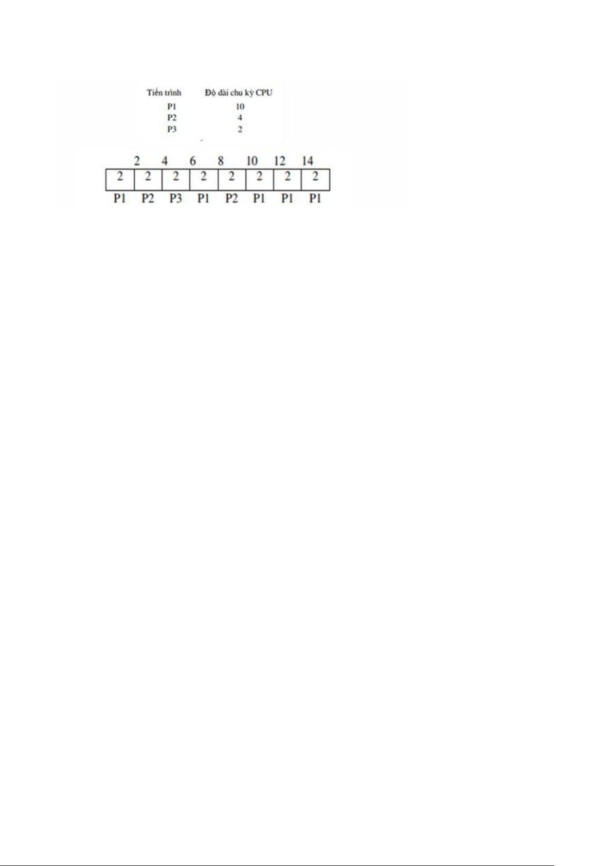 - Tiến trình sẽ lần lượt được cấp CPU trong những khoảng thời gian t trước khi bị ngắt và CPU được cấp cho tiến trình khác
