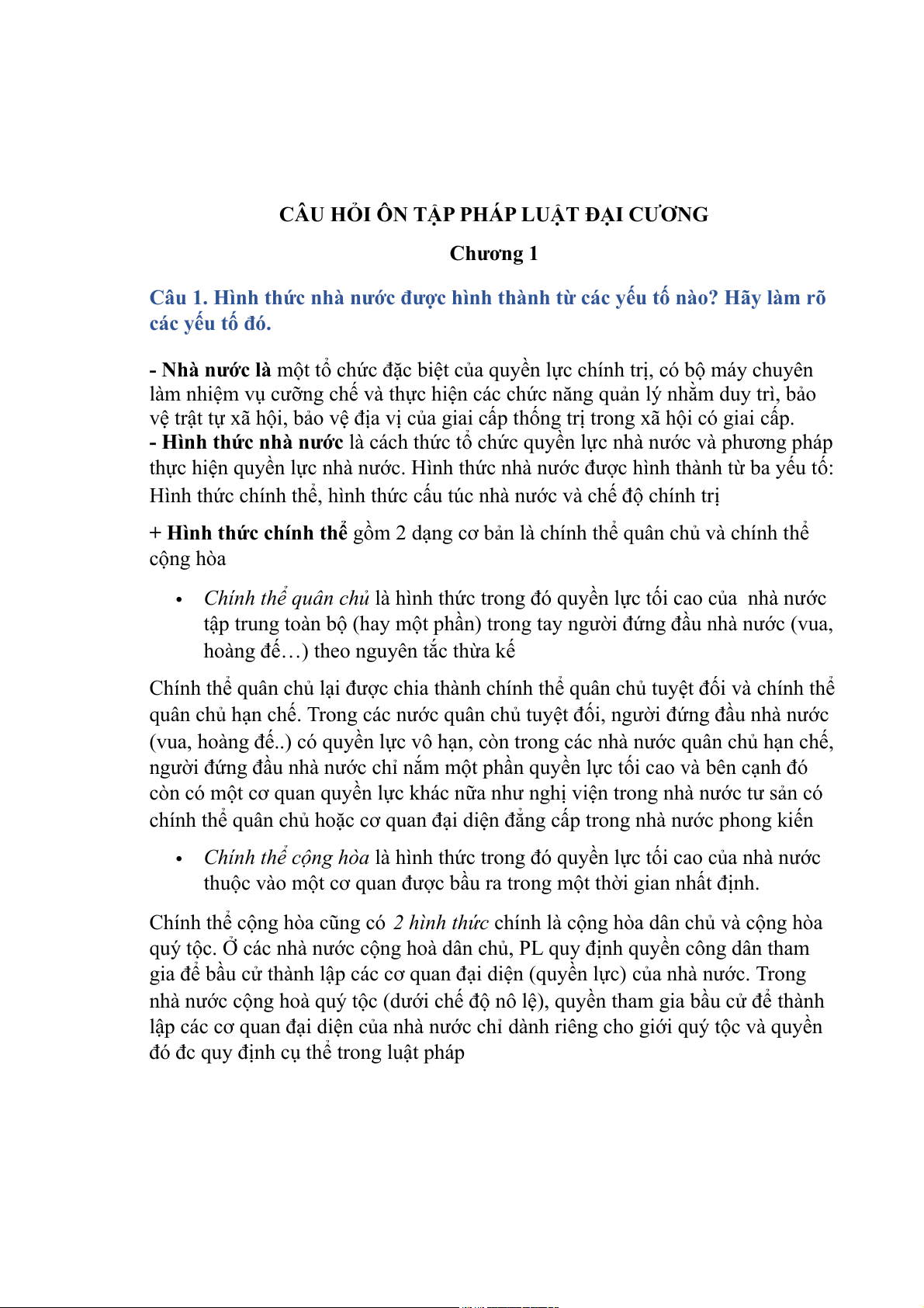 Câu 1. Hình thức nhà nước được hình thành từ các yếu tố nào? Hãy làm rõ các yếu tố đó.