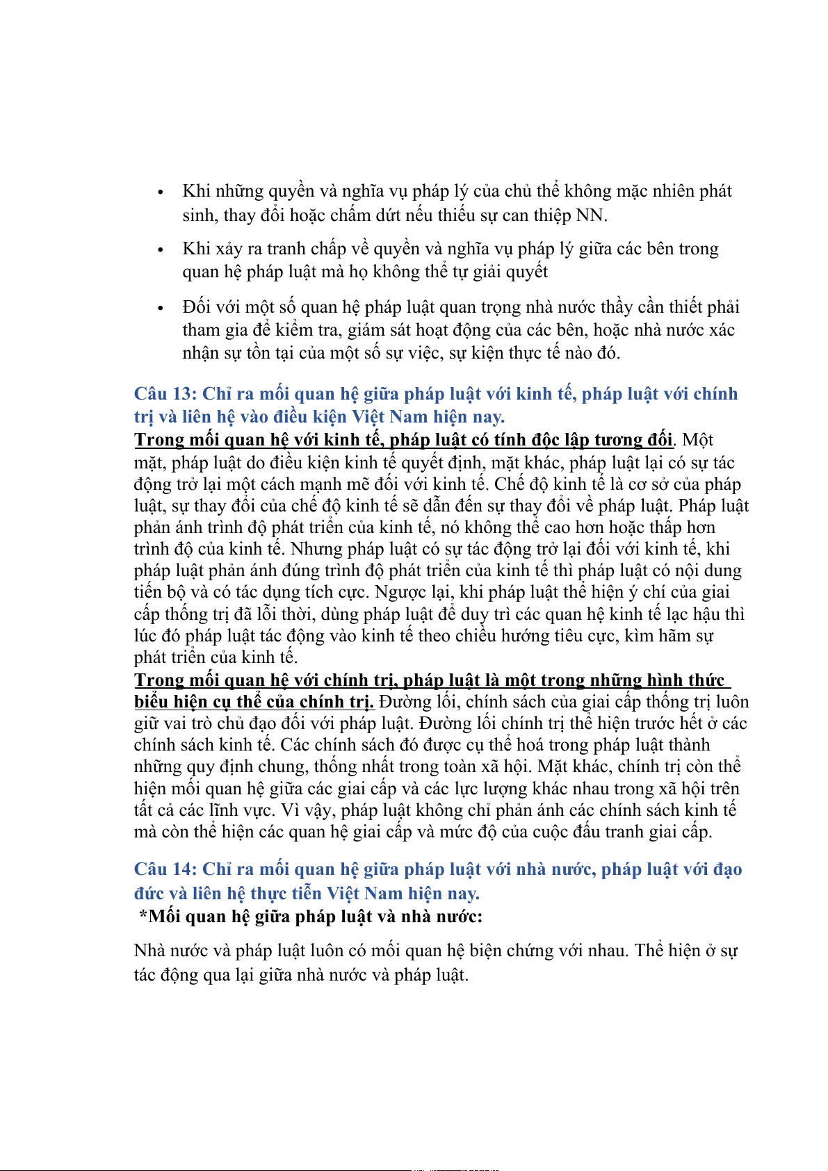 Câu 13: Chỉ ra mối quan hệ giữa pháp luật với kinh tế, pháp luật với chính